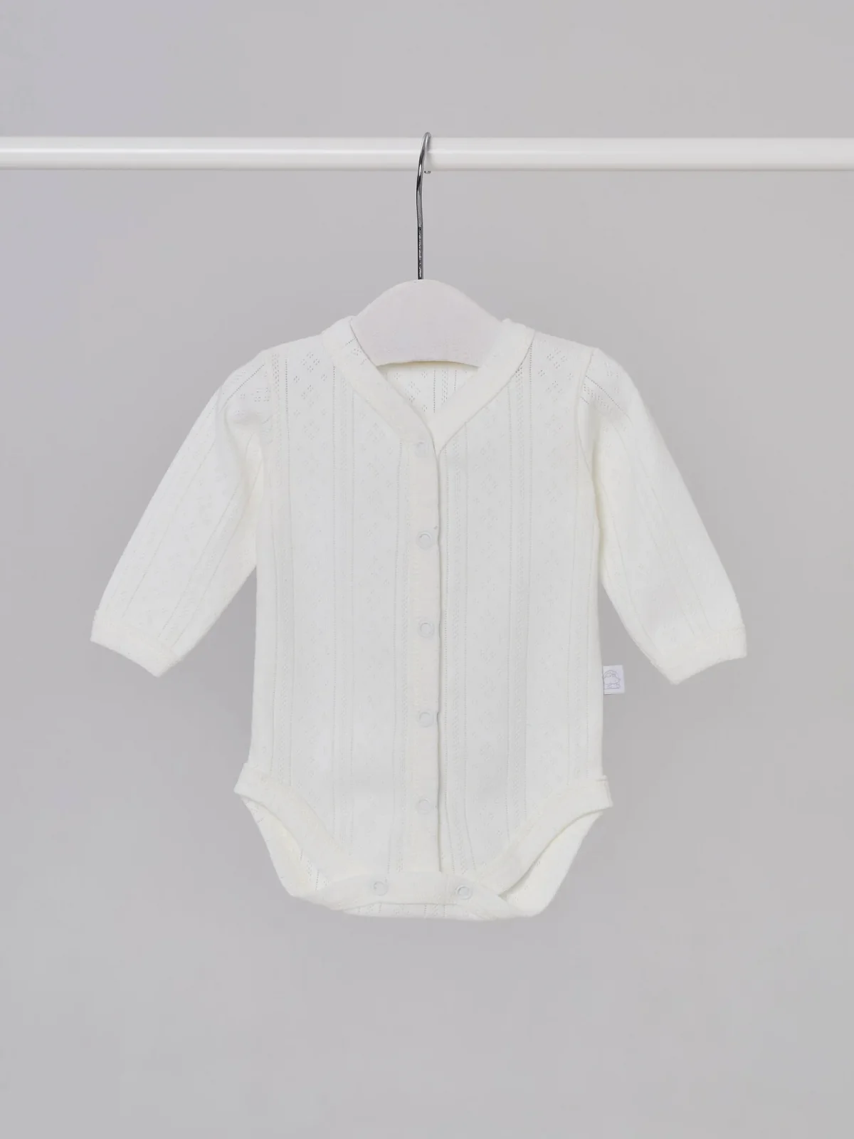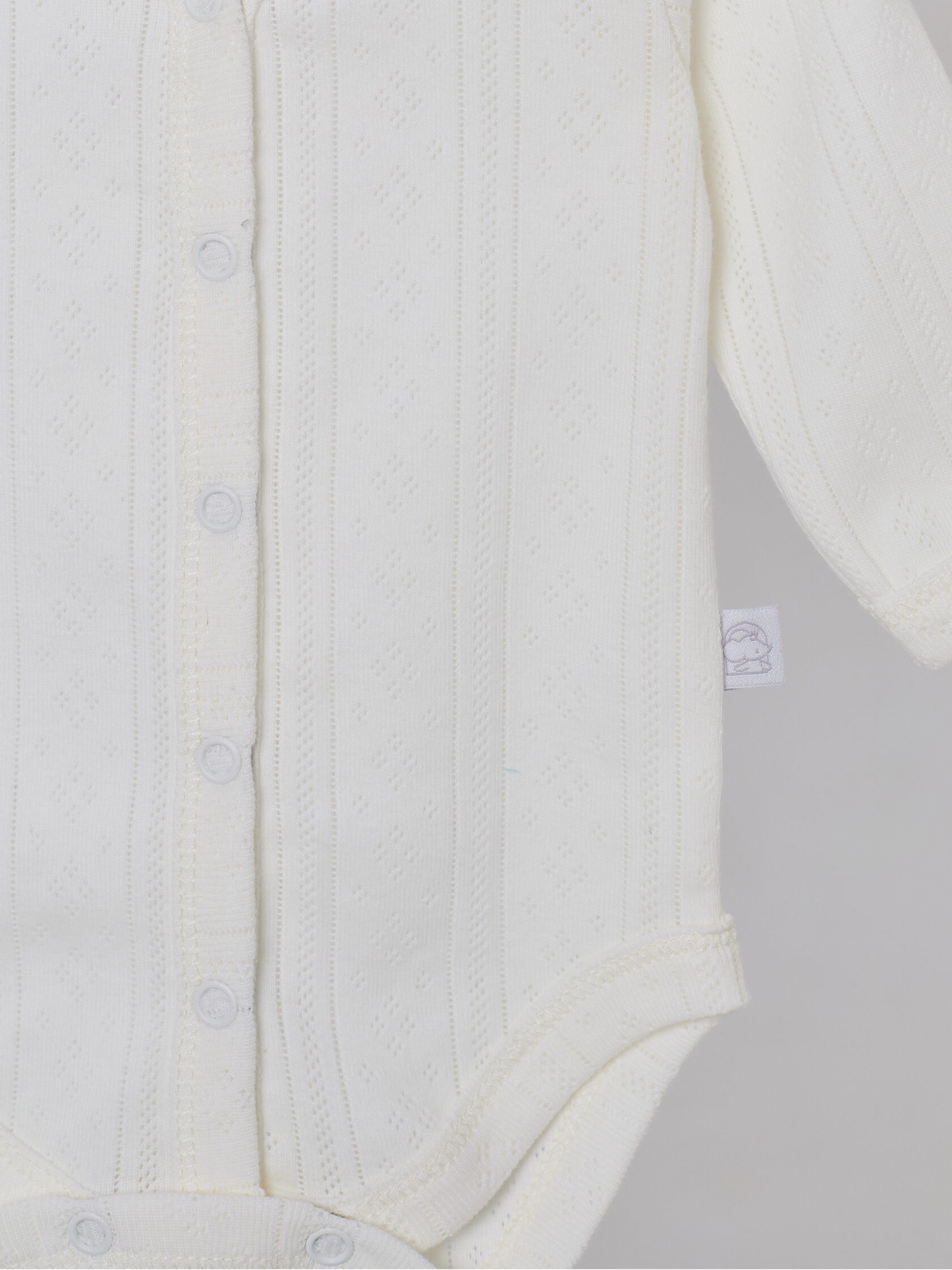 Боди ажурный, с центральным замком на кнопоках и длинным рукавом. Нежный и очень красивый боди подойдет как на выписку, так и на каждый день.