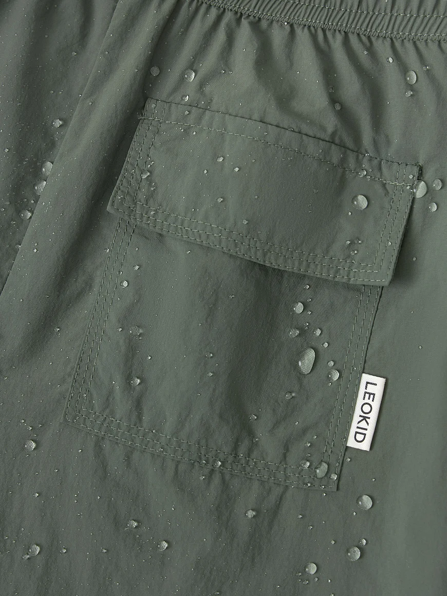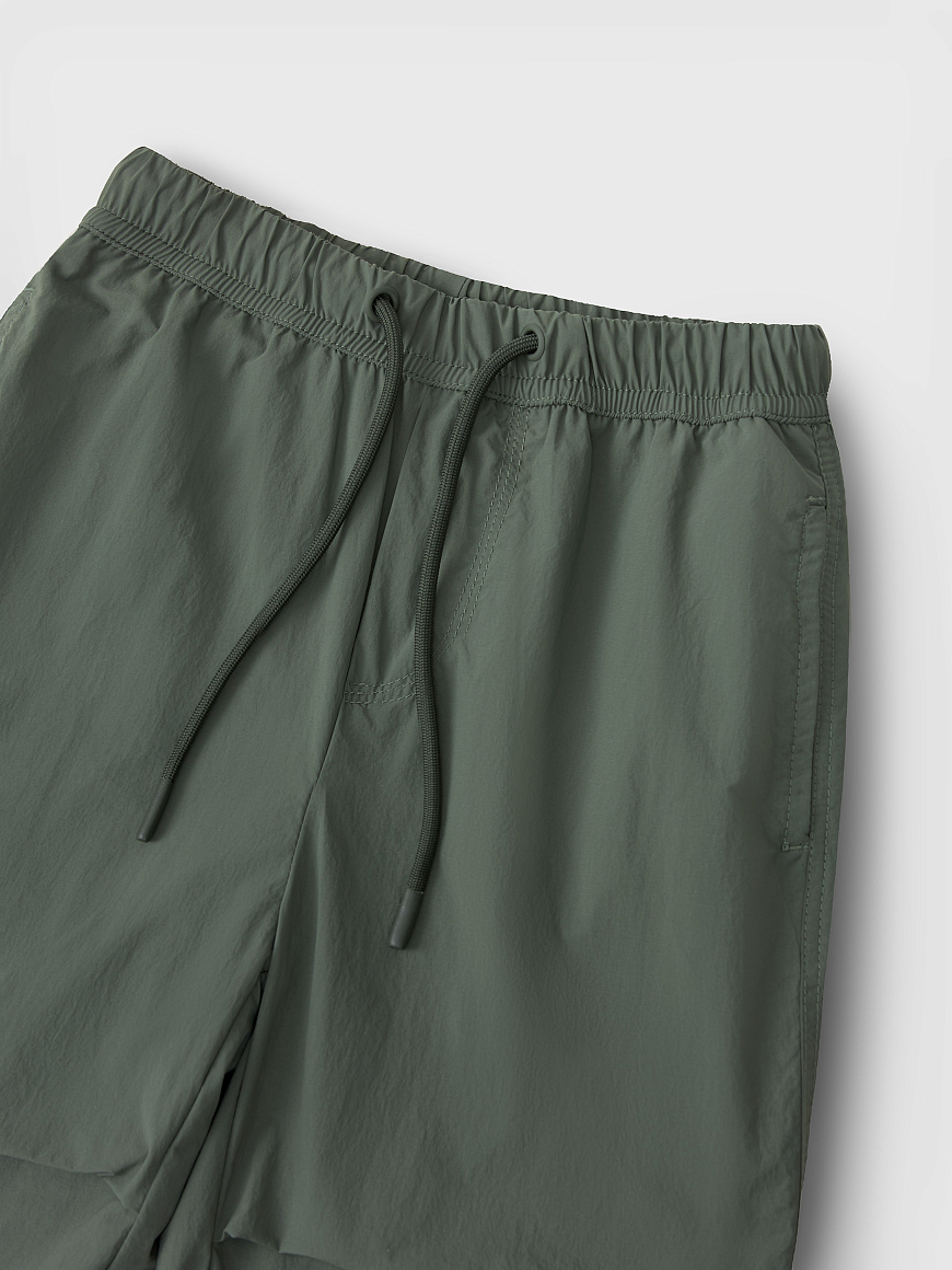 -ткань с жатым эффектом -пояс на внутренней резинке с декоративным шнуром -хлопковая трикотажная подкладка -2 боковых кармана - карман с клапаном и фирменным флажком сзади -внизу брюки на резинке -складки для объема на коленях -водоотталкивающая пропитка