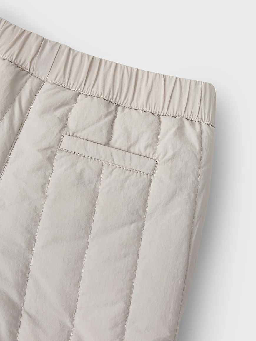 — ткань с жатым эффектом и вертикальной стежкой — пояс на внутренней резинке — регулирующая утяжка внутри пояса — хлопковая трикотажная подкладка — 2 боковых кармана — декоративный карман сзади — легкий листовой утеплитель 100г/m2 — водоотталкивающая пропитка — можно носить как утепляющий слой
