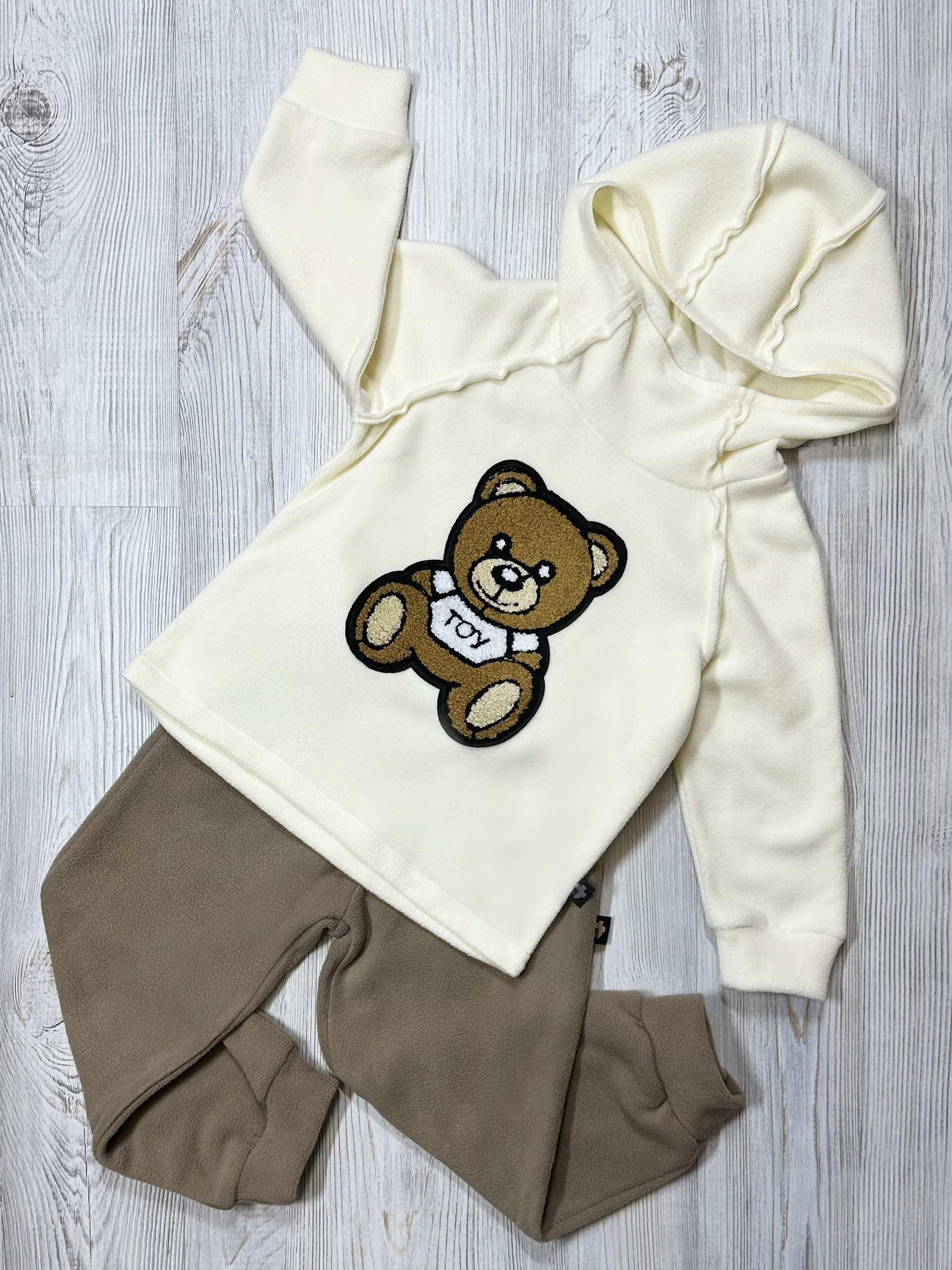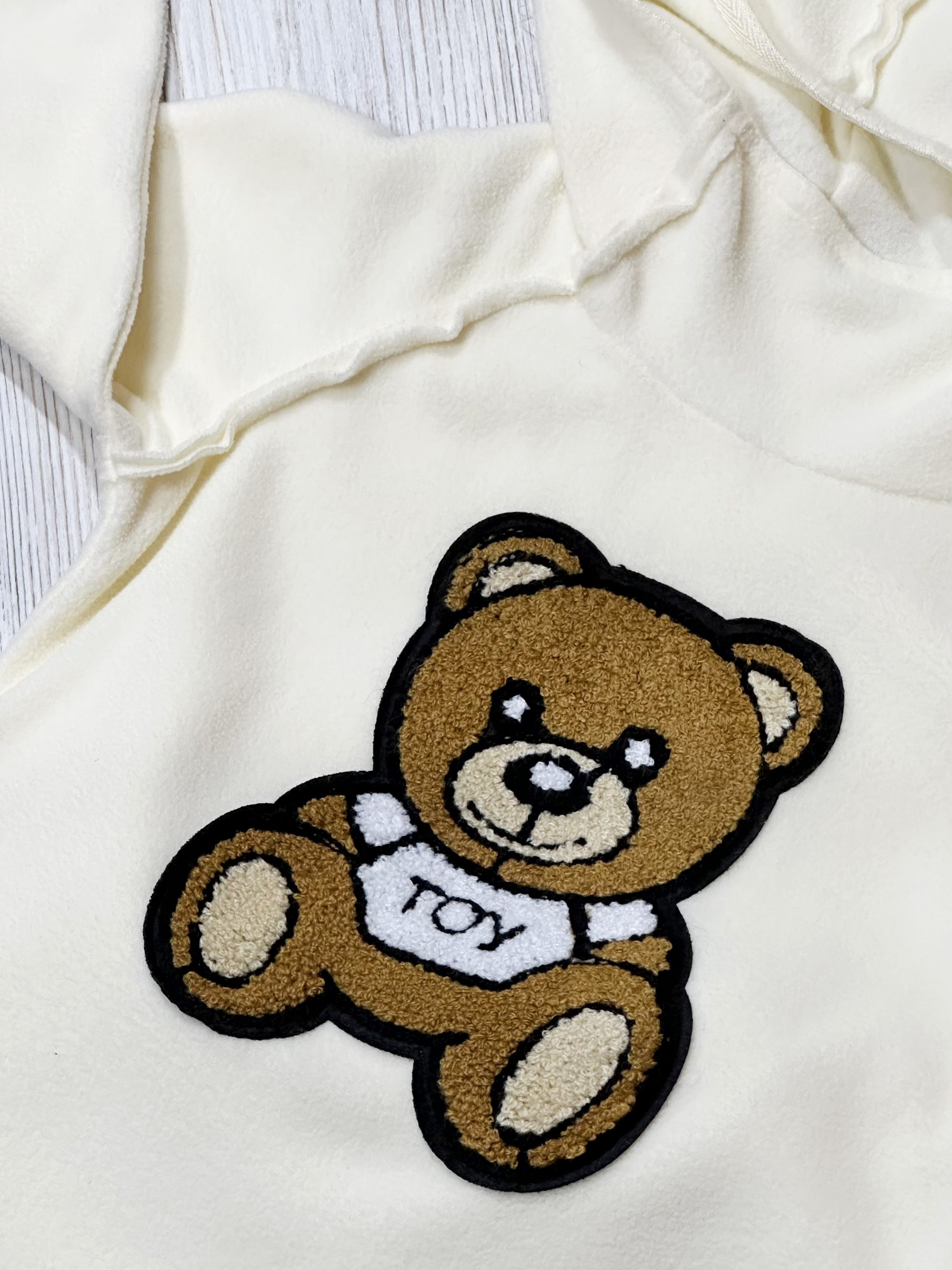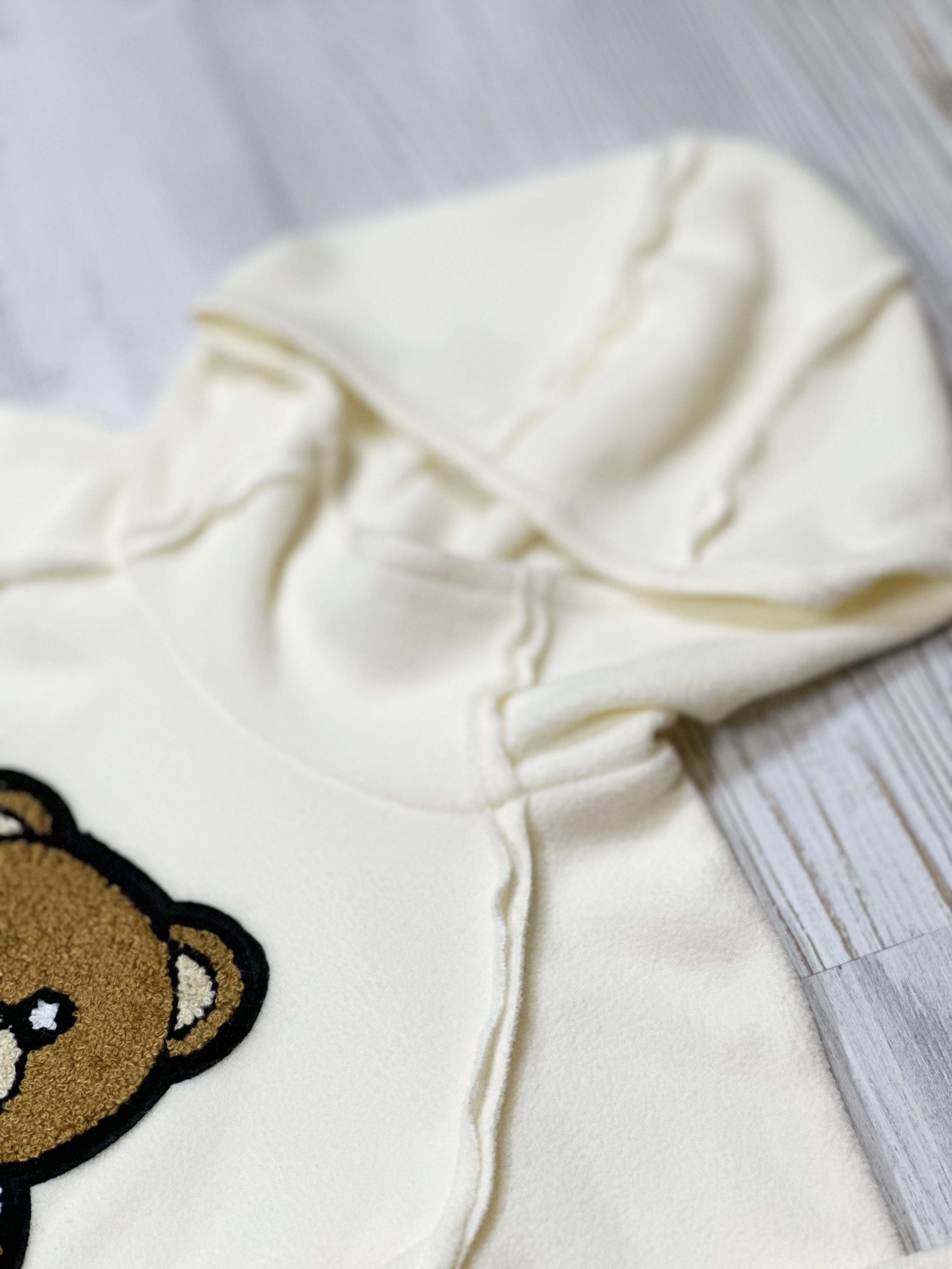 Сливочная толстовка с необычной декоративной отделкой швами снаружи, включая капюшон, создает оригинальный и современный образ. На передней части кофты расположена объемная, фактурная нашивка с изображением милого медвежонка, придающая образу особый шарм. Штанишки бежевого цвета на манжетах, без карманов, идеально сочетаются с кофтой и создают гармоничный образ.