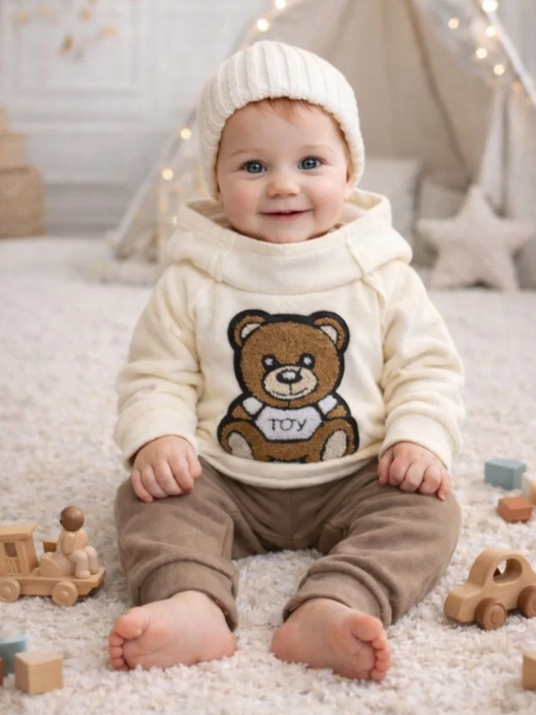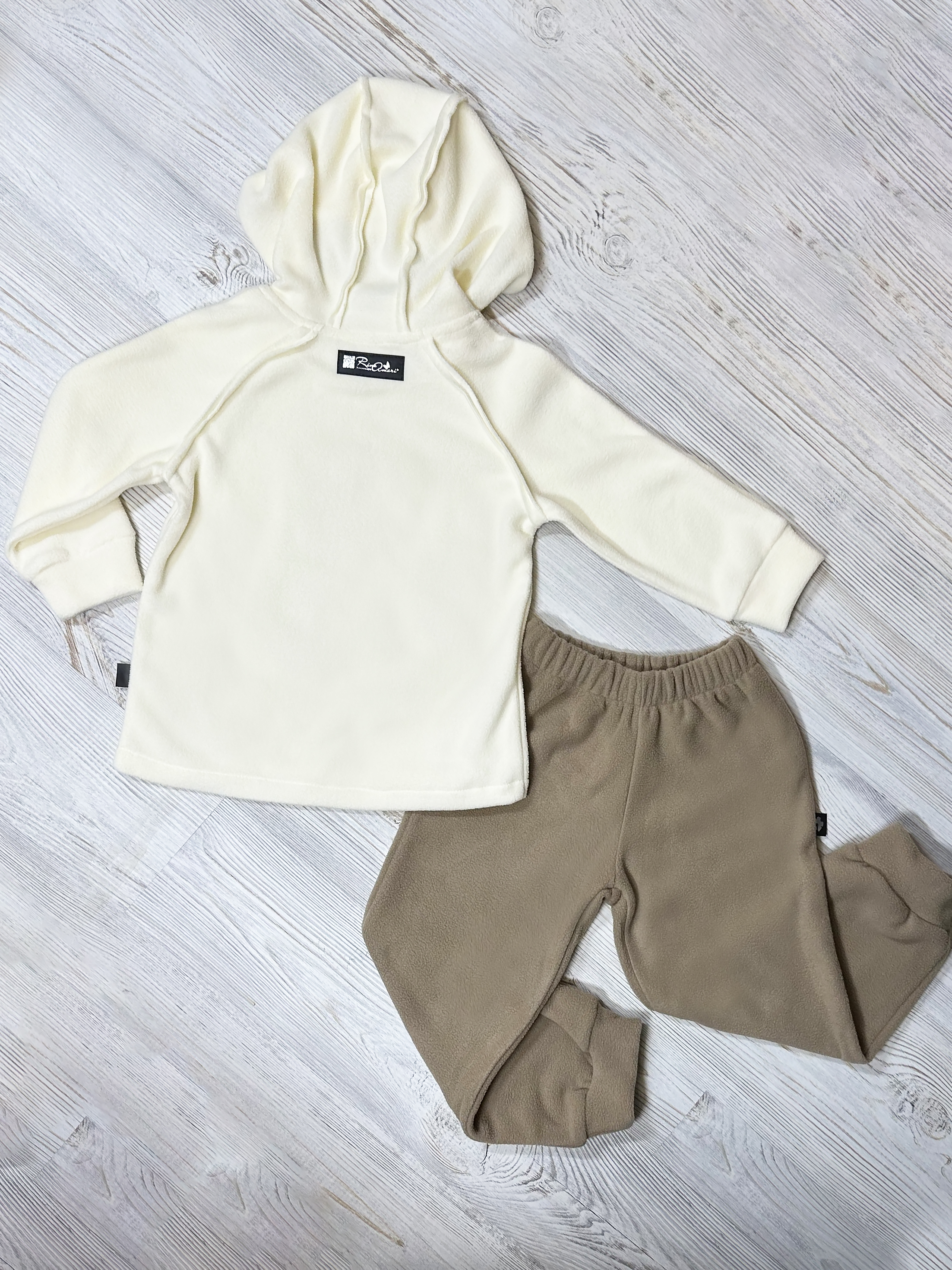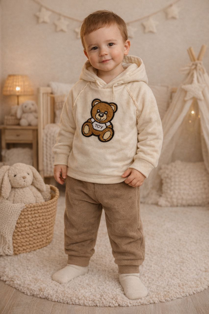 Сливочная толстовка с необычной декоративной отделкой швами снаружи, включая капюшон, создает оригинальный и современный образ. На передней части кофты расположена объемная, фактурная нашивка с изображением милого медвежонка, придающая образу особый шарм. Штанишки бежевого цвета на манжетах, без карманов, идеально сочетаются с кофтой и создают гармоничный образ.