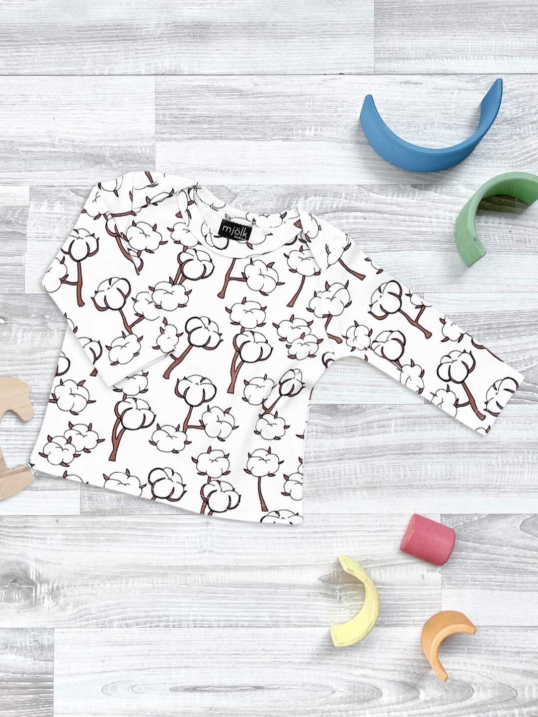Комфортная футболка Mjolk с длинным рукавом для малыша выполнена из плотного мягкого трикотажа. Горловина сшита внахлест, что позволяте надевать ее не только через голову, но и через ножки, собрав в гармошку. Футболка отлично дополнит образ с ползунками или под полукомбинезон. Вы также можете ее использовать отдельно с памперсом.