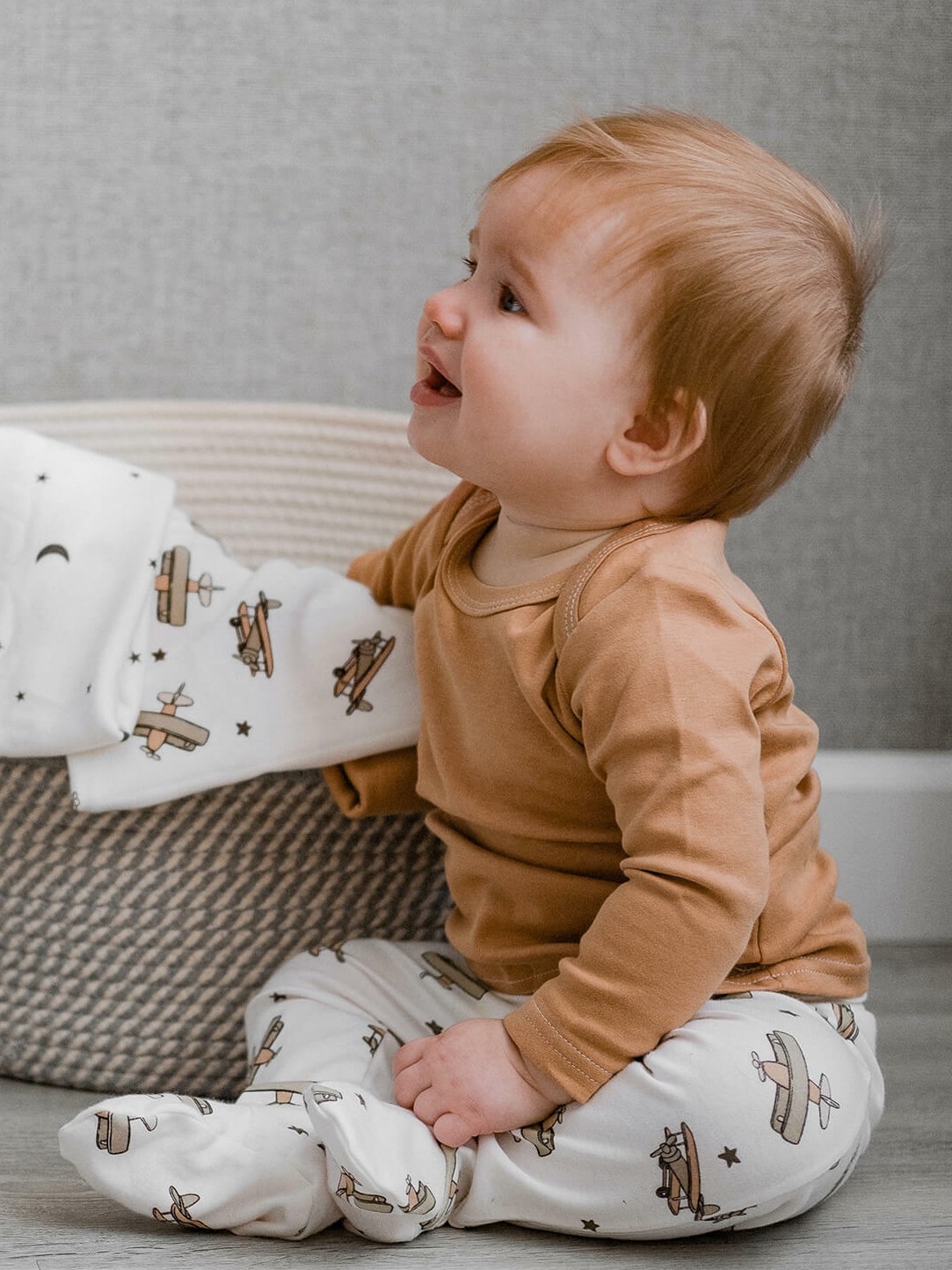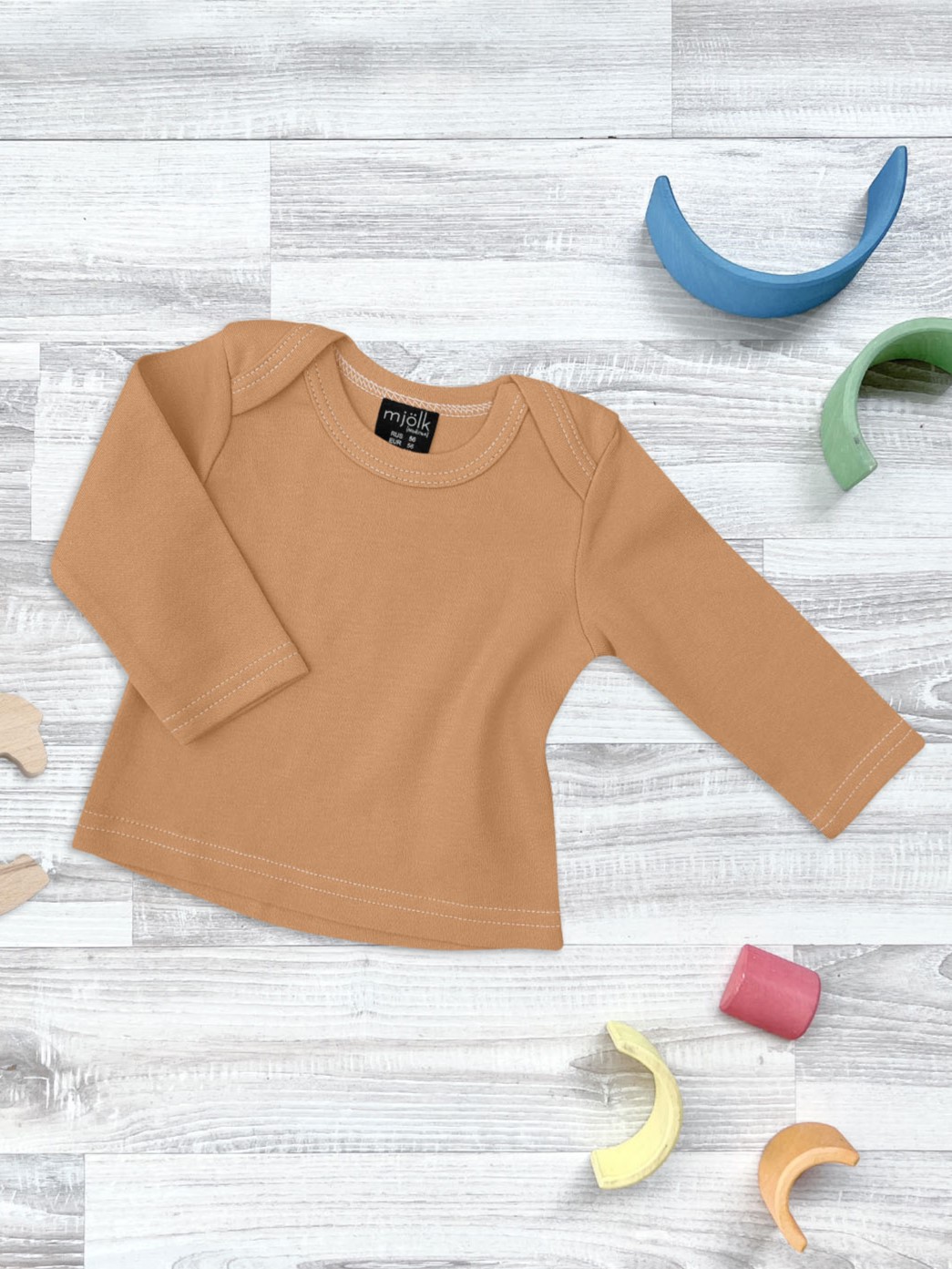 Комфортная футболка Mjolk с длинным рукавом для малыша выполнена из плотного мягкого трикотажа. Горловина сшита внахлест, что позволяте надевать ее не только через голову, но и через ножки, собрав в гармошку. Футболка отлично дополнит образ с ползунками или под полукомбинезон. Вы также можете ее использовать отдельно с памперсом.