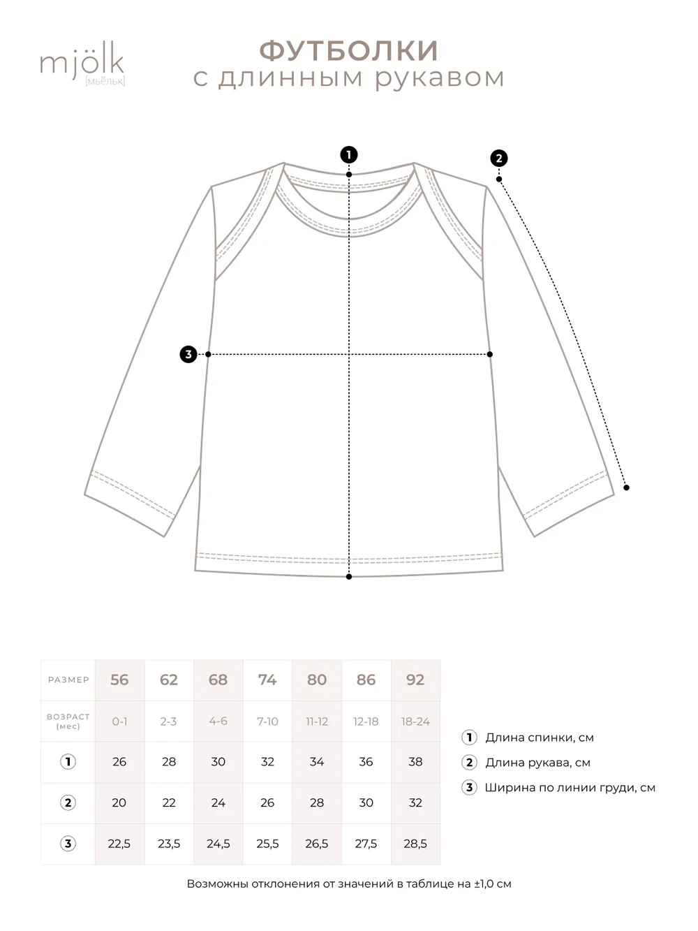 Футболка Mjölk [мьёльк] – это удобный вариант раздельной одежды для малышей от одного месяца. Изделие представляет собой футболку с длинным рукавом, выполненную из плотного и очень мягкого трикотажа. Плечики нашиваются внахлёст, благодаря этому горловина более широкая и топ можно надевать не только через голову, но и через ножки, собрав изделие гармошкой. Футболка подойдёт для носки круглый год. Дополнить образ можно шапочкой или нагрудниками в цвет.