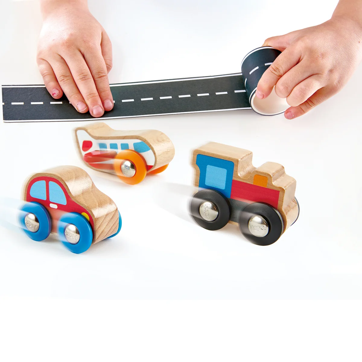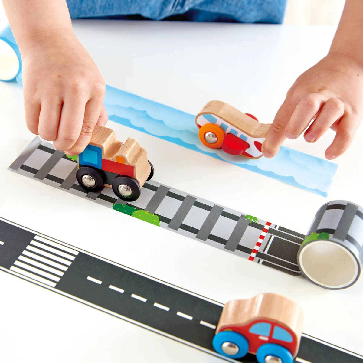 рулон клейкой ленты с узором облаков, деревянный самолетик.
