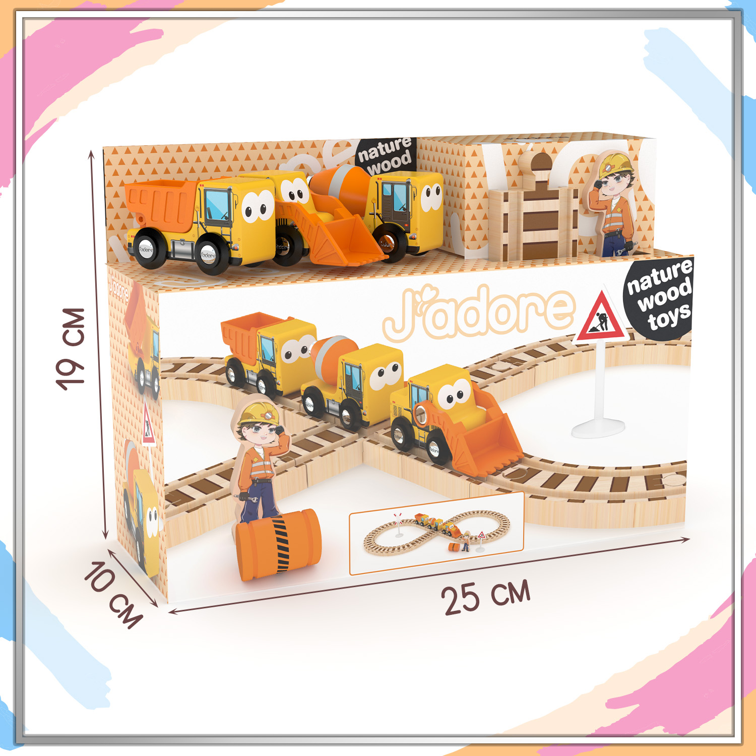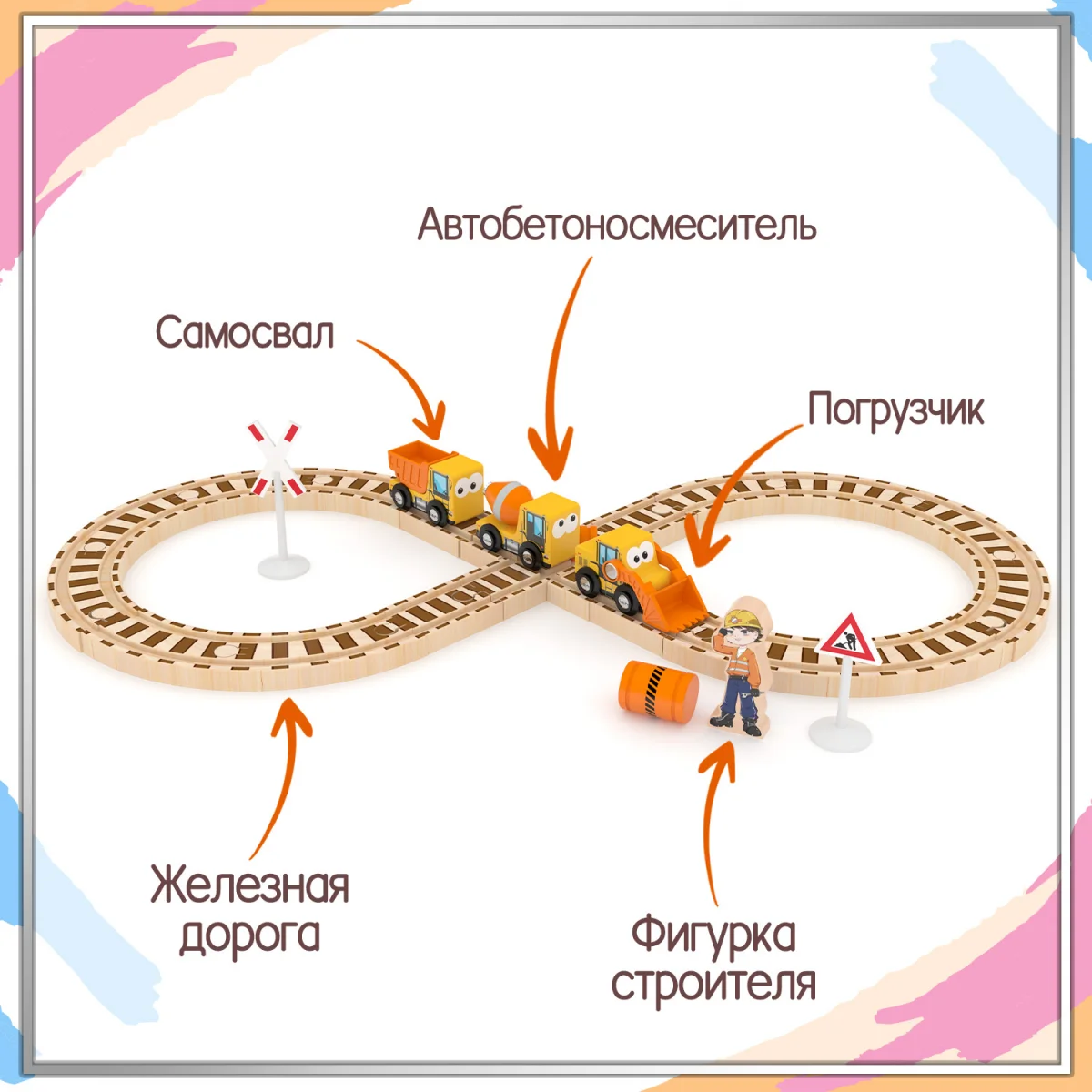 Строительная площадка с подъёмными кранами, грузовиками и железнодорожными путями — для тех, кто мечтает возводить города. Поезд доставляет материалы, спецтехника работает на объекте, а ребёнок руководит процессом.