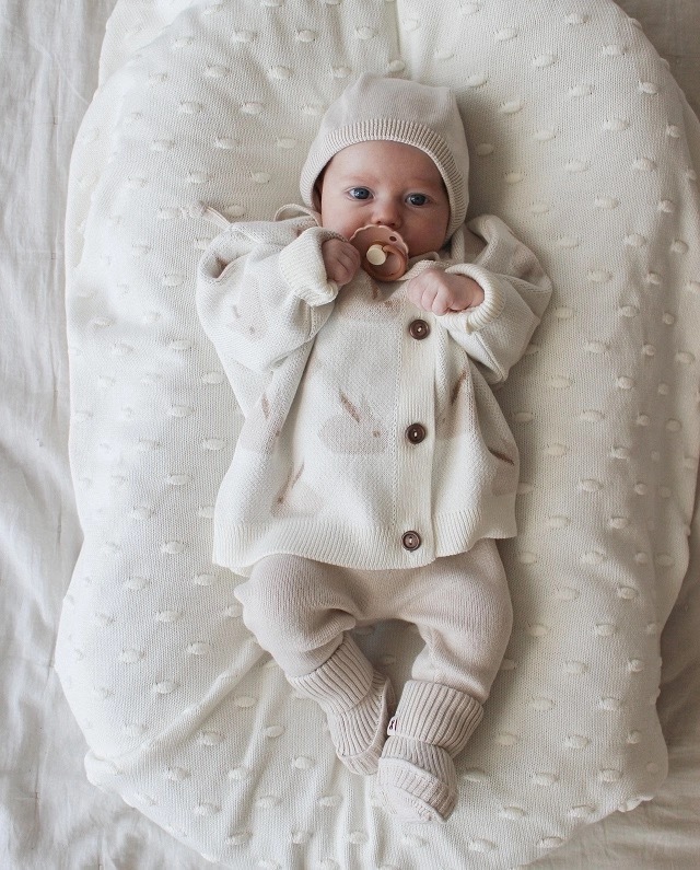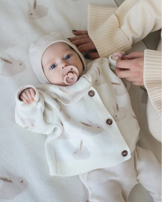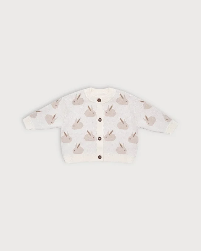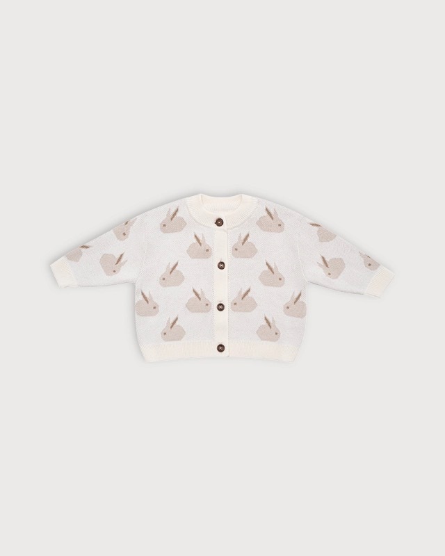 Кардиган с кроликами с застежкой на деревянные пуговицы. Связан из высококачественной 100% хлопковой пряжи с сертификатом ОЕКО-Тех 100.