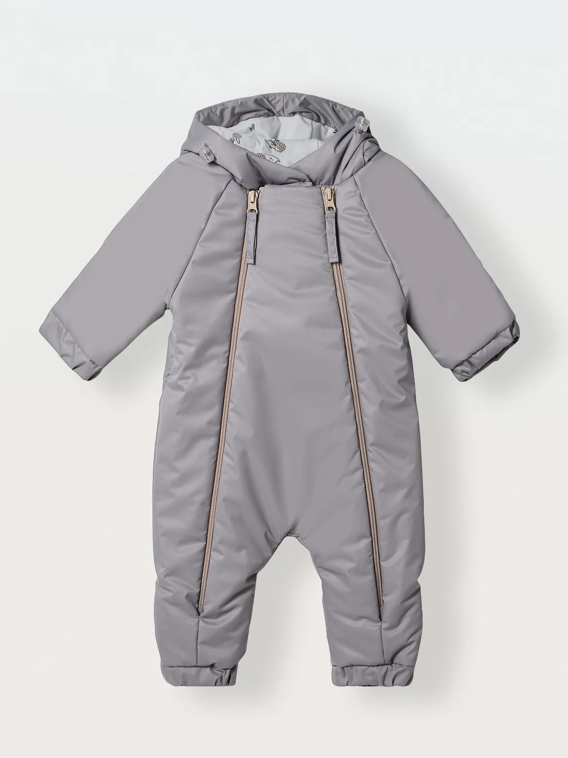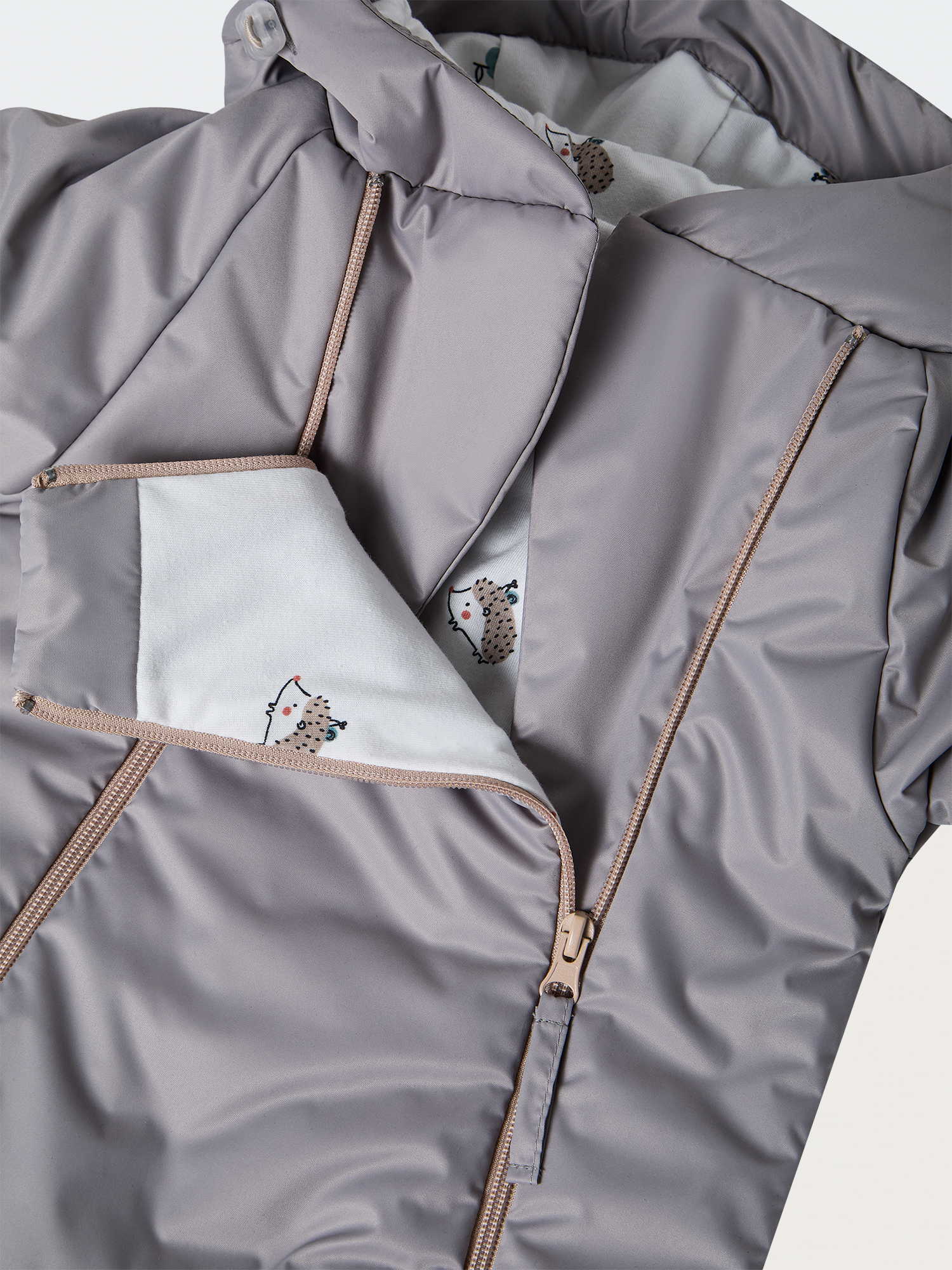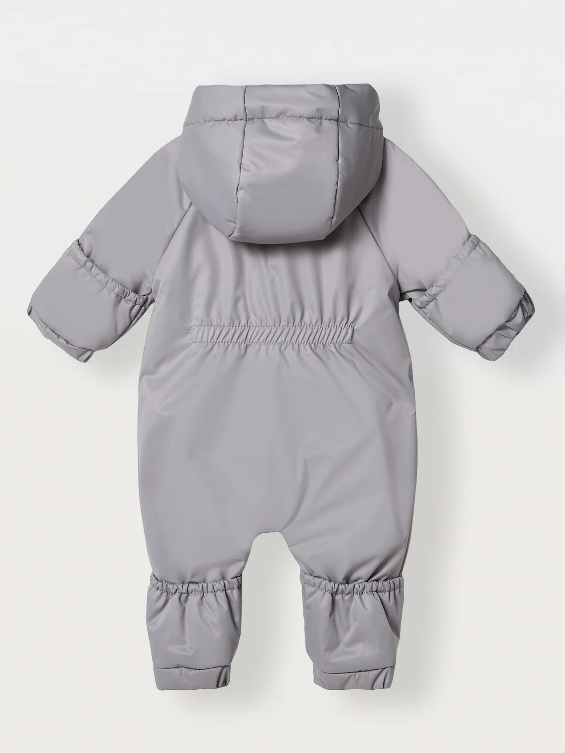 Легко надевать даже на новорождённых благодаря двум молниям. Пока малыш маленький, манжеты удобно закрыть, что избавит от необходимости надевать носочки и рукавички. Далее можно добавить пинетки. Глубокий капюшон имеет утяжки.