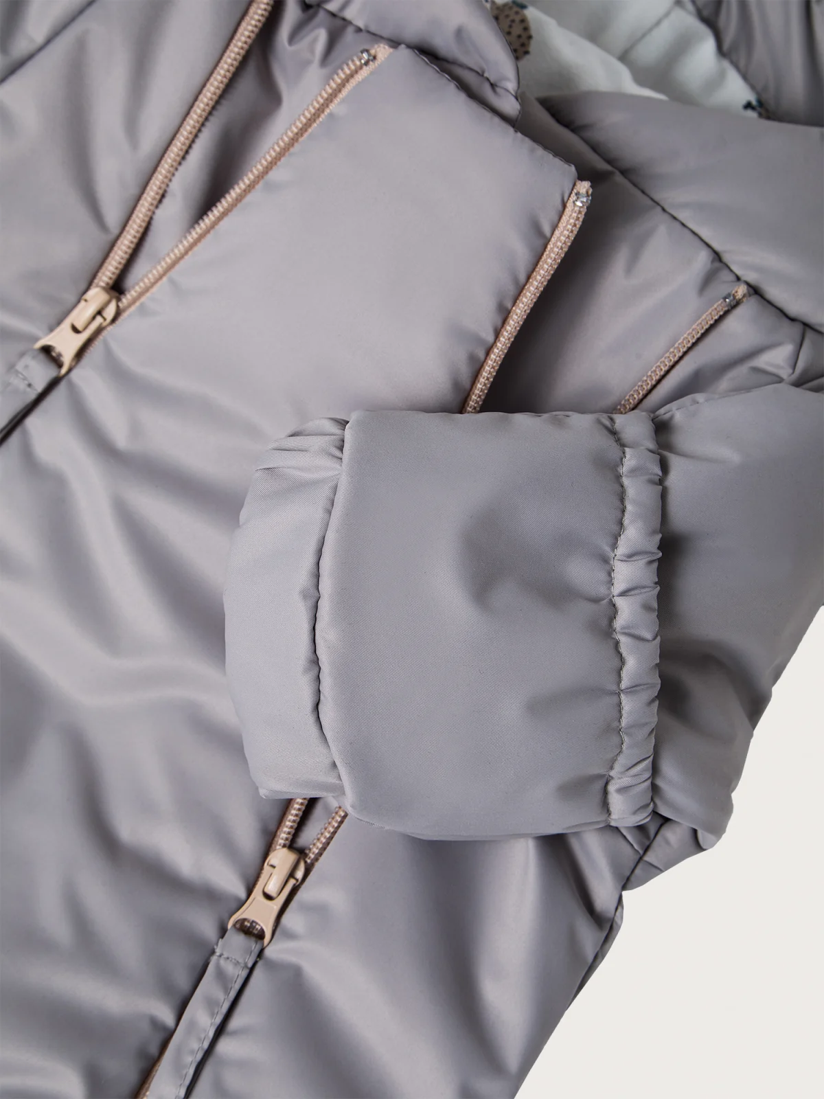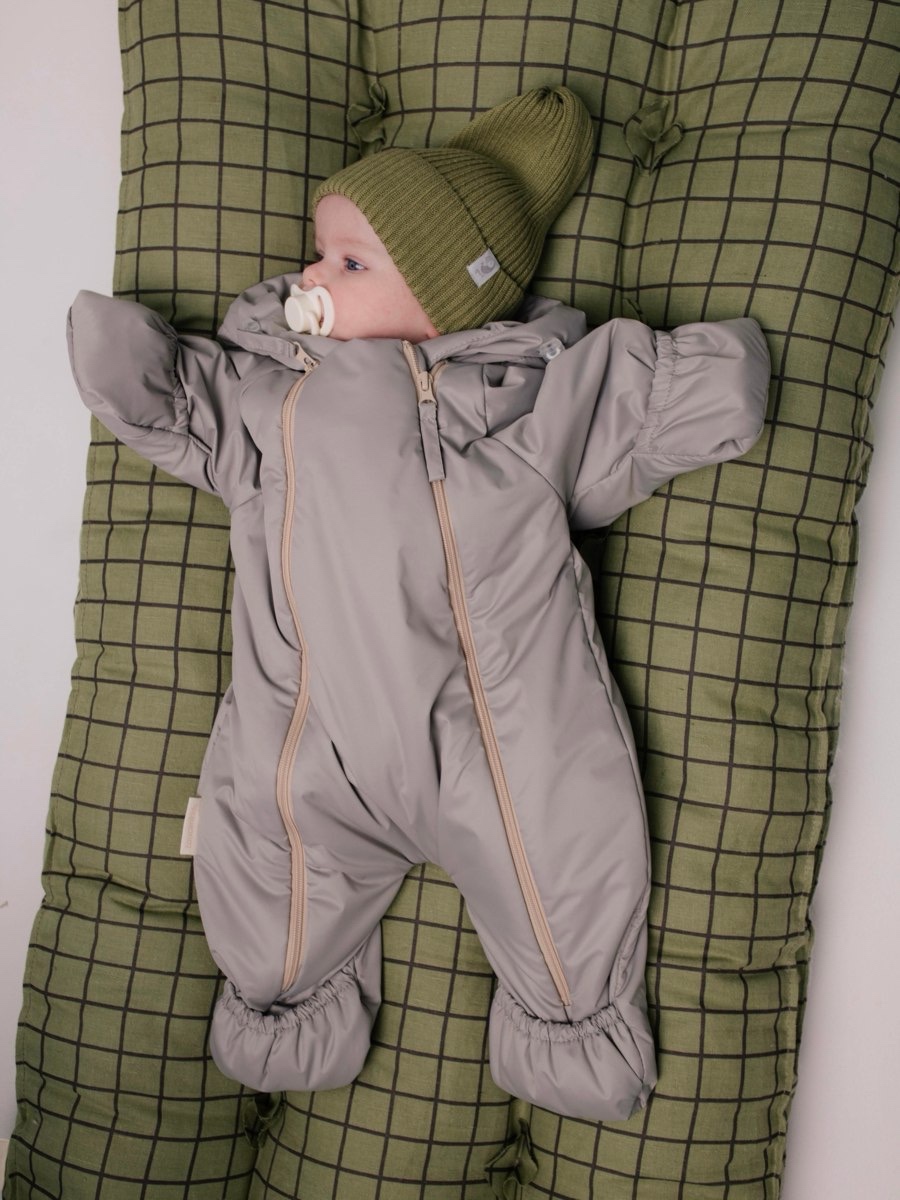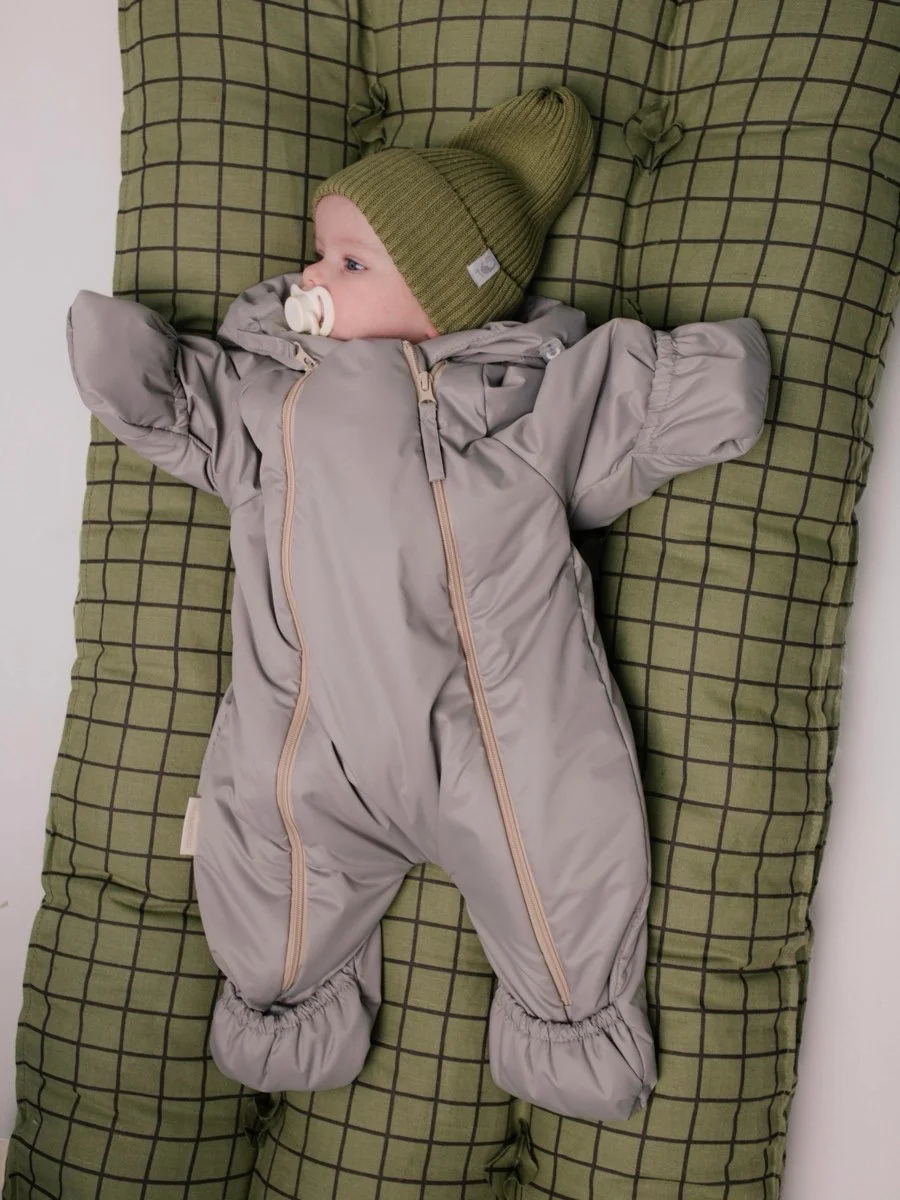 Легко надевать даже на новорождённых благодаря двум молниям. Пока малыш маленький, манжеты удобно закрыть, что избавит от необходимости надевать носочки и рукавички. Далее можно добавить пинетки. Глубокий капюшон имеет утяжки.