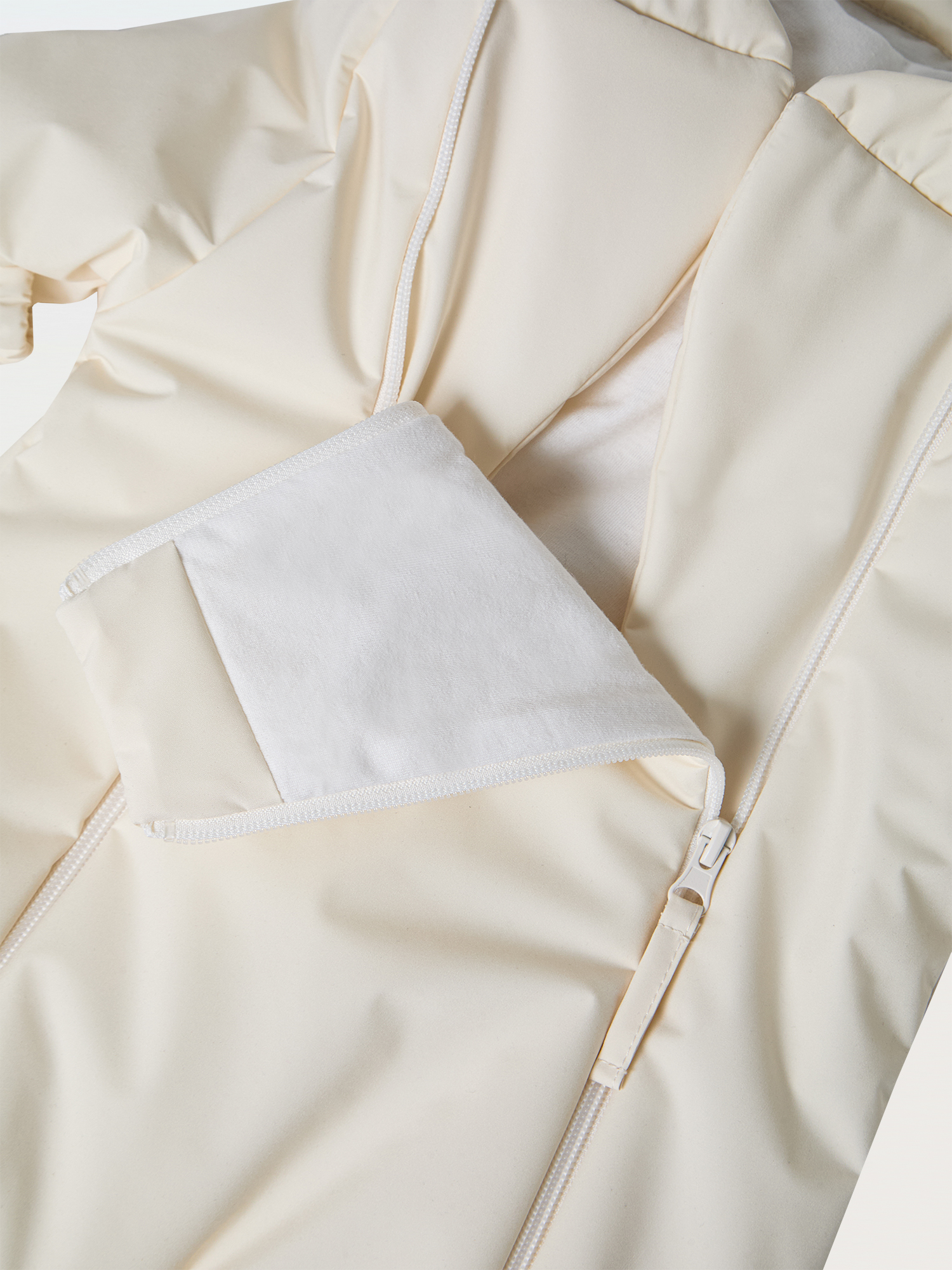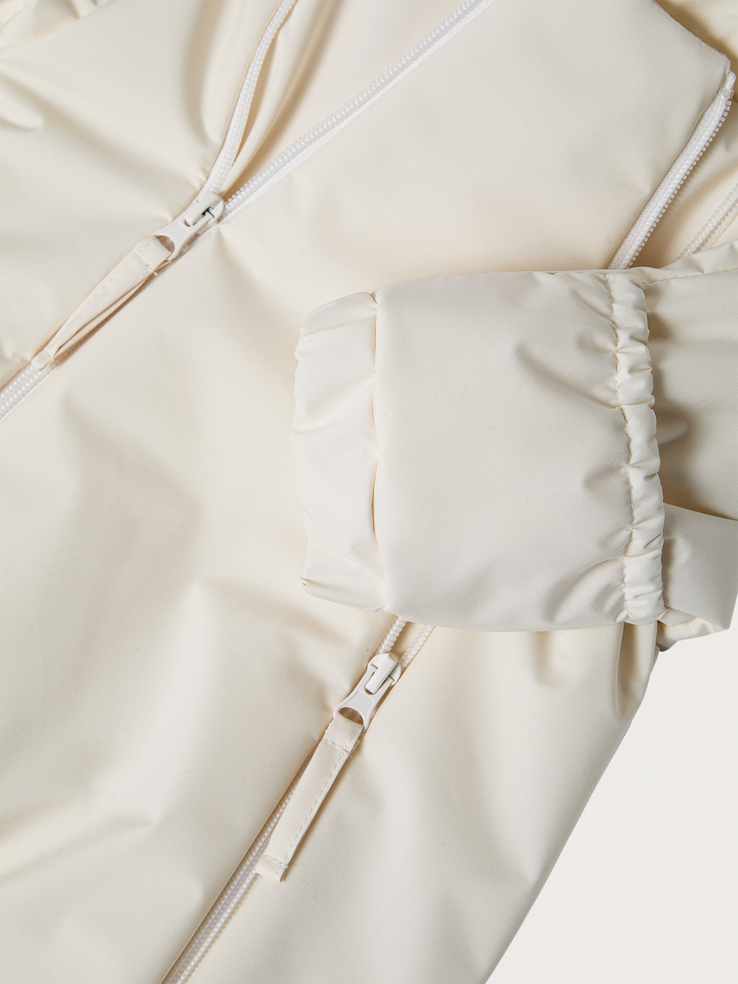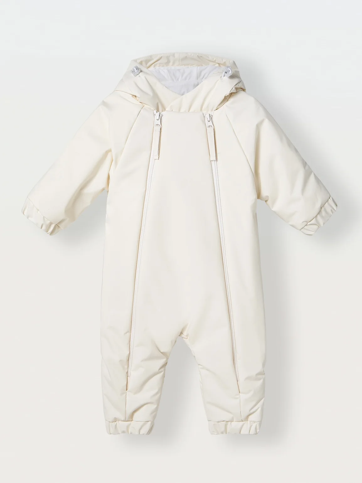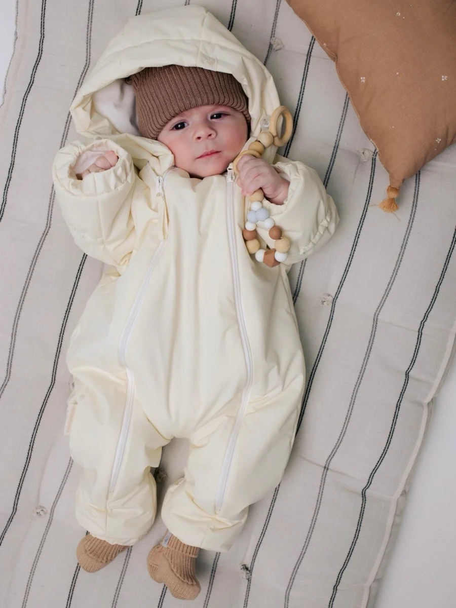 Легко надевать даже на новорождённых благодаря двум молниям. Пока малыш маленький, манжеты удобно закрыть, что избавит от необходимости надевать носочки и рукавички. Далее можно добавить пинетки. Глубокий капюшон имеет утяжки.