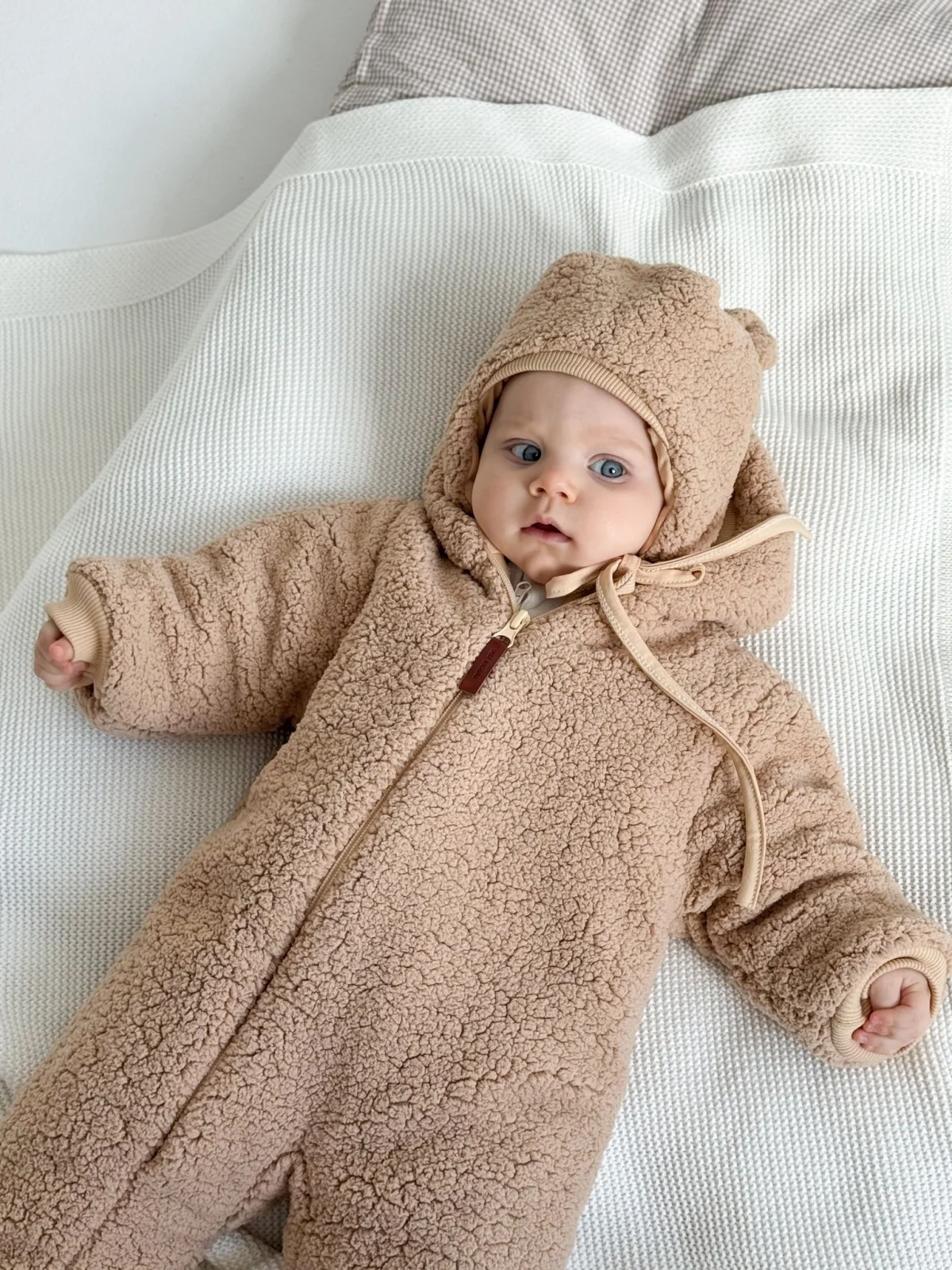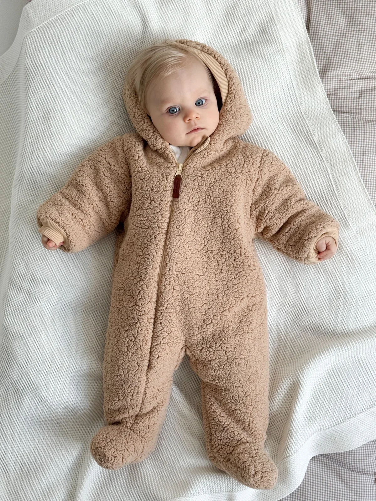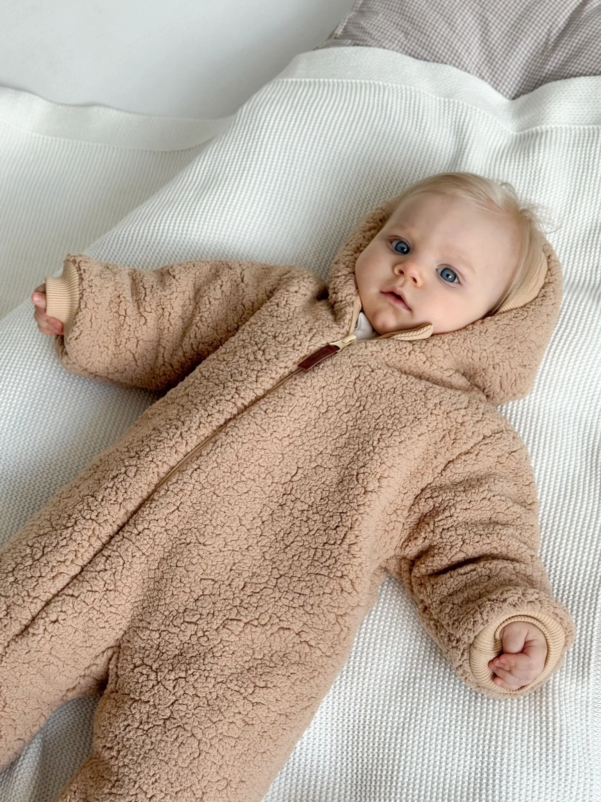 К комбинезону можно подобрать тёплый кокон из шерпы — получится комплект для комфортных прогулок зимой и в межсезонье.
