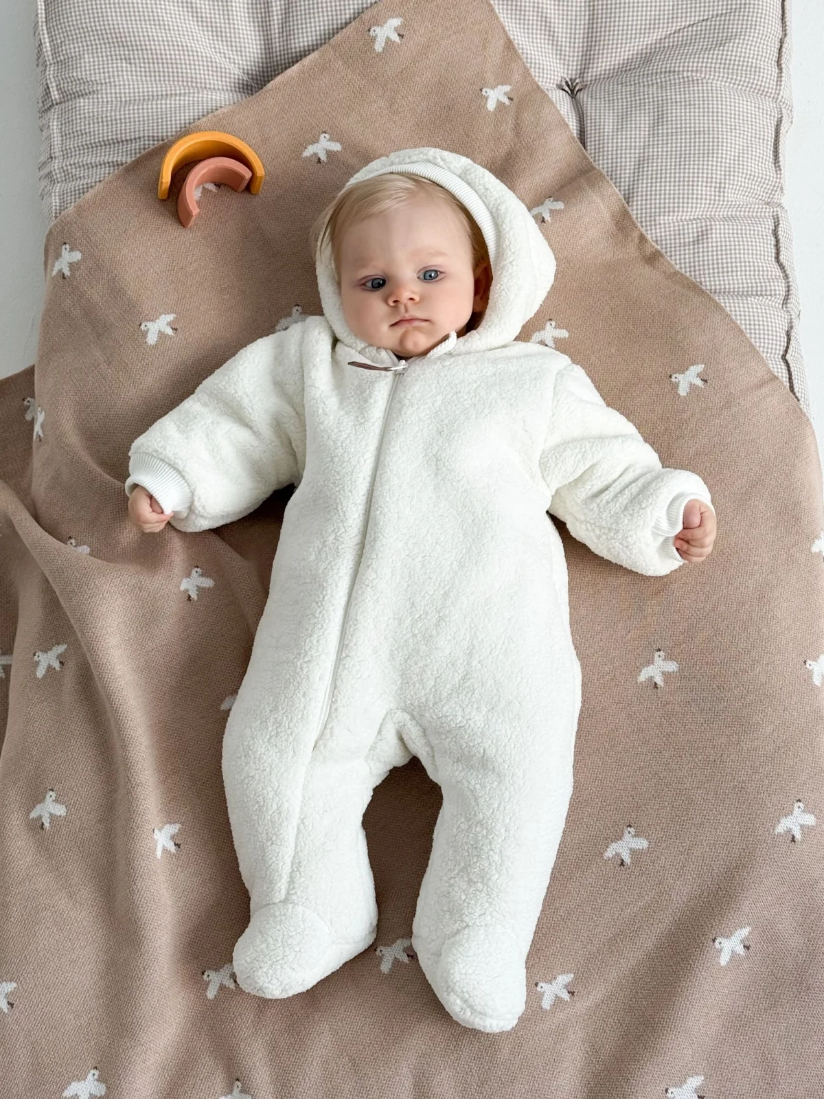 К комбинезону можно подобрать тёплый кокон из шерпы — получится комплект для комфортных прогулок зимой и в межсезонье.