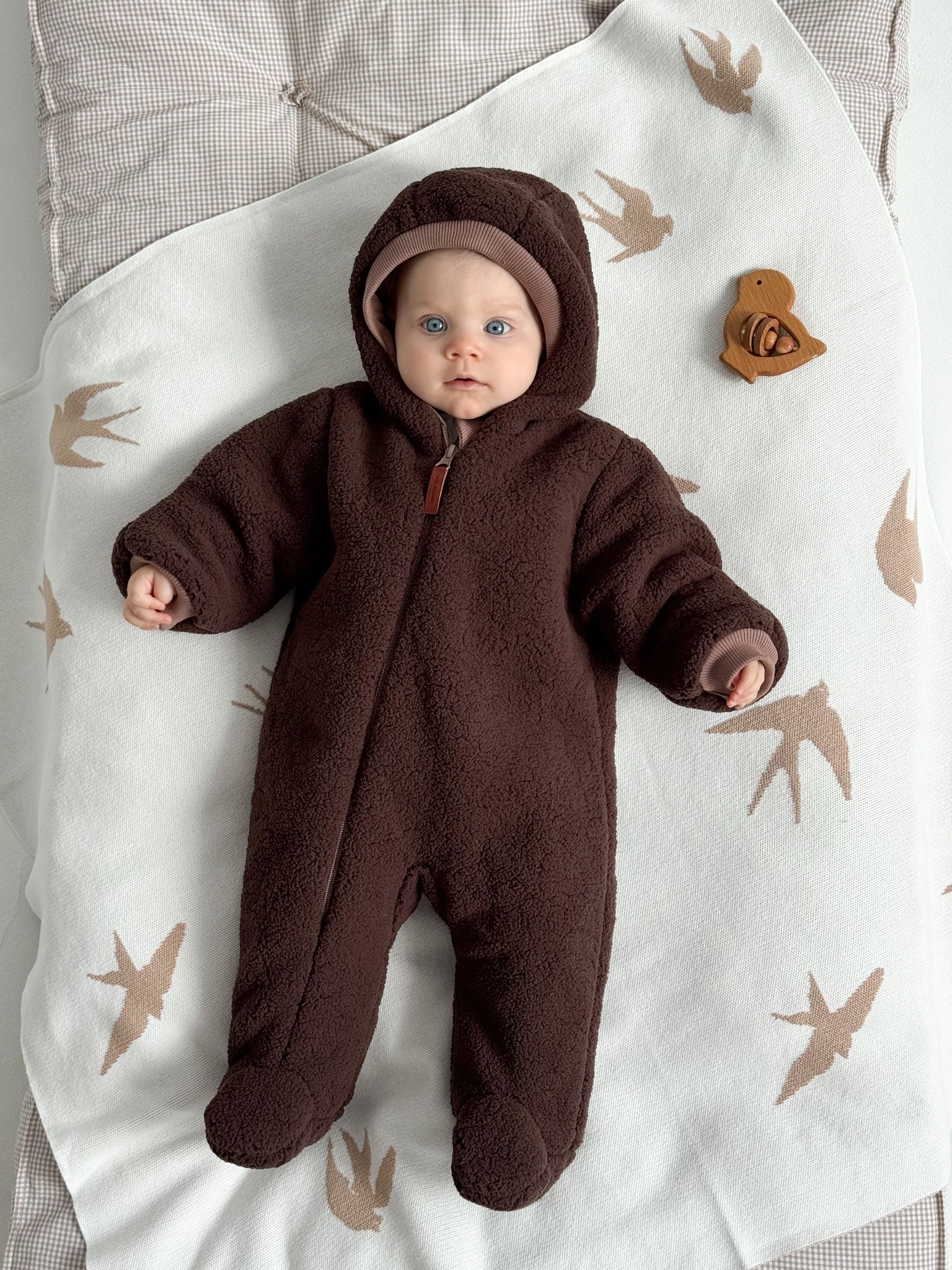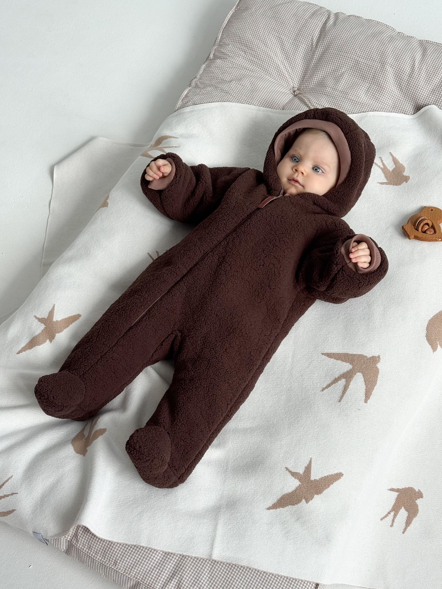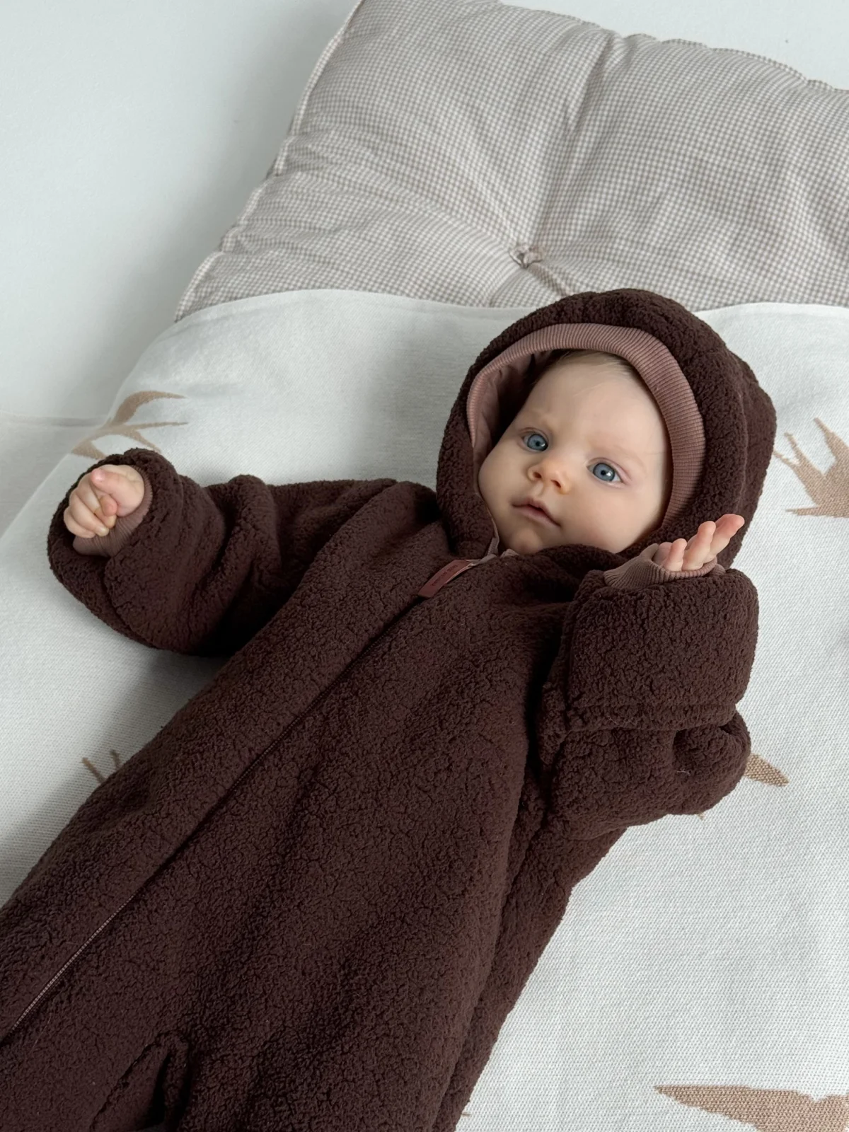 К комбинезону можно подобрать тёплый кокон из шерпы — получится комплект для комфортных прогулок зимой и в межсезонье.