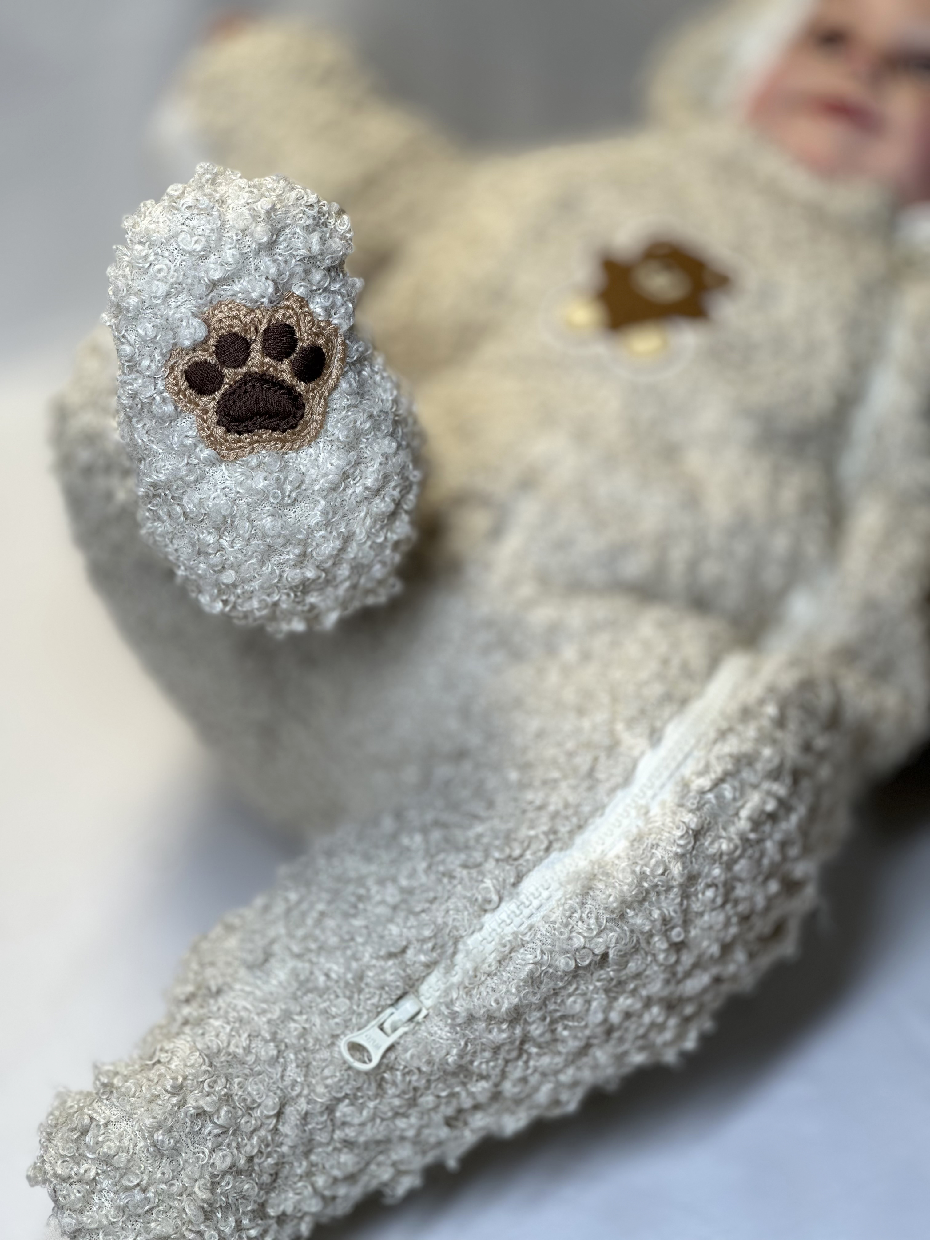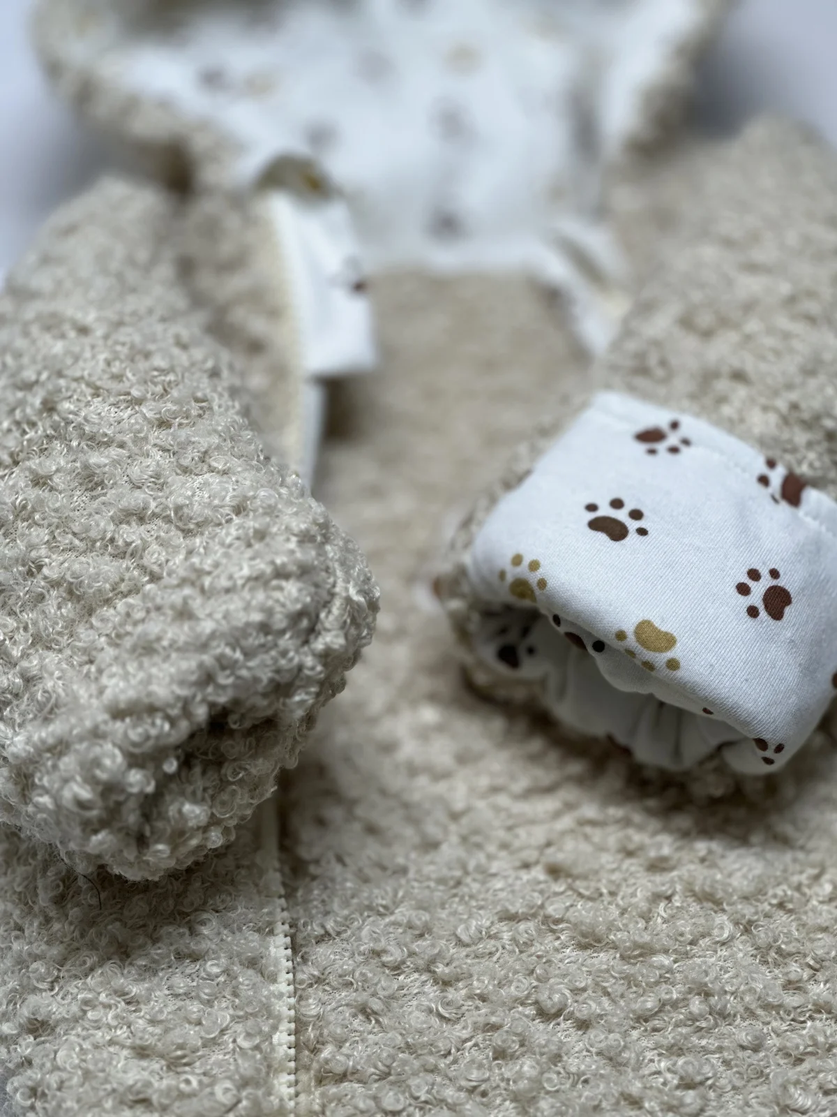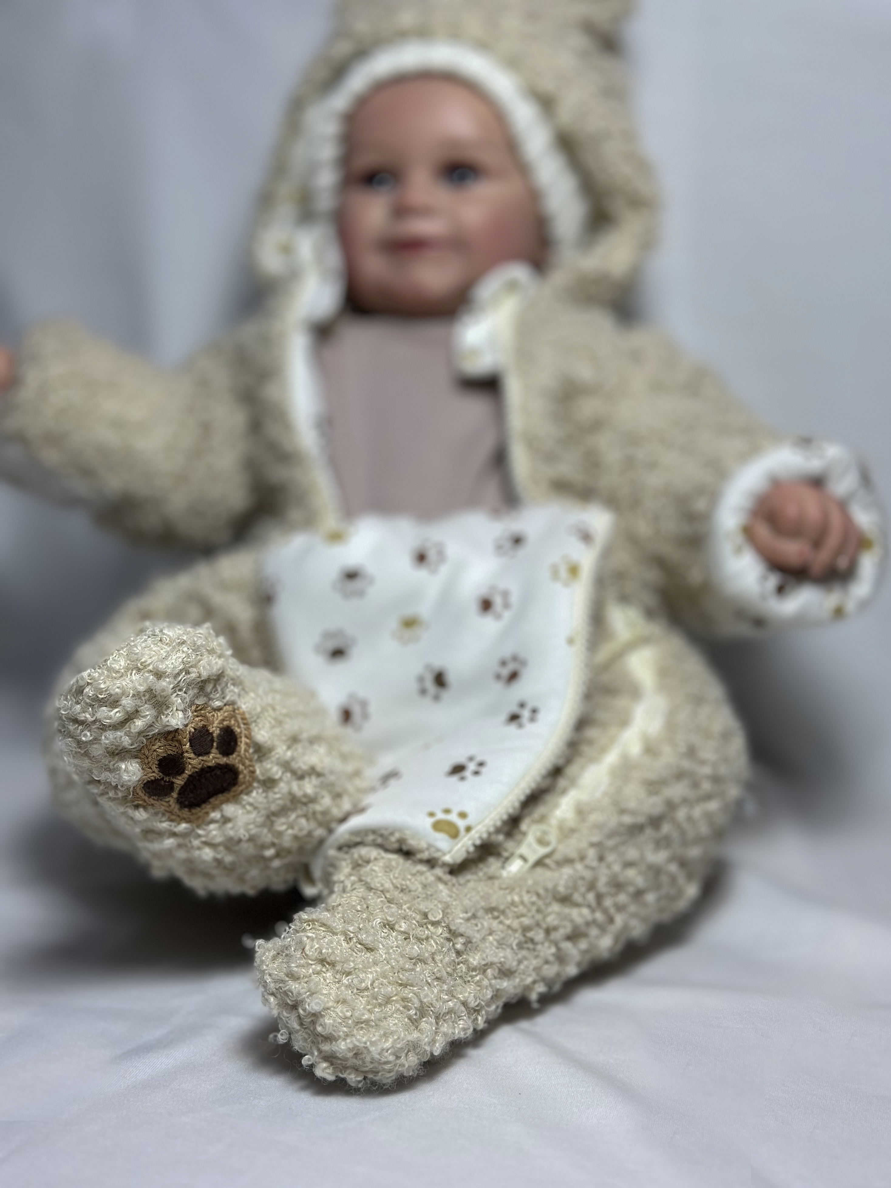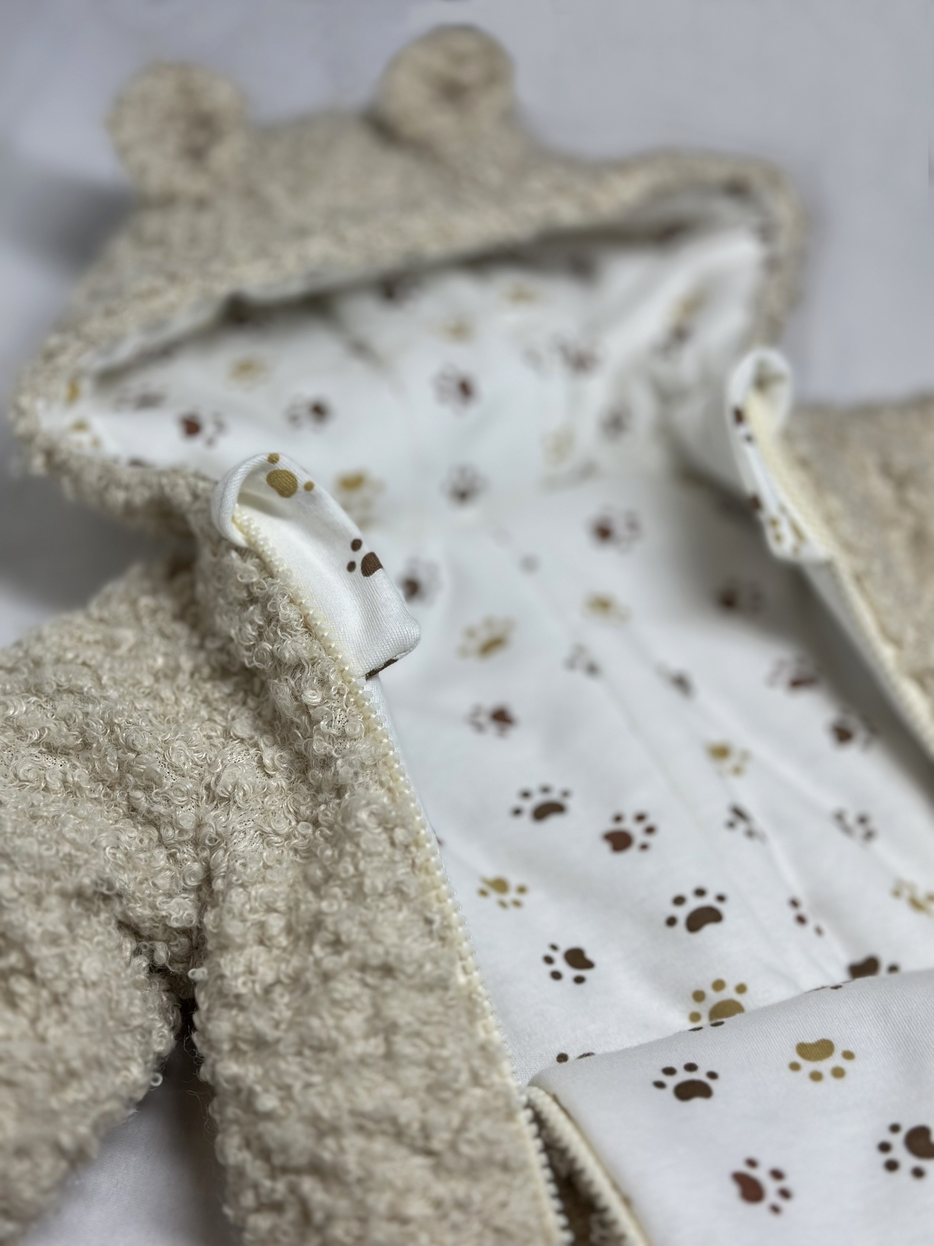 Комбинезон оснащен двумя молниями для удобного и быстрого одевания, а капюшон украшен милыми ушками медведя, придавая образу особую милоту. Ручки можно закрывать для защиты от холодного ветра или открывать по необходимости. Внутри расположена мягкая подкладка из 100% хлопка с забавным принтом лапок, которая обеспечивает приятное ощущение на ощупь и дополнительный комфорт.