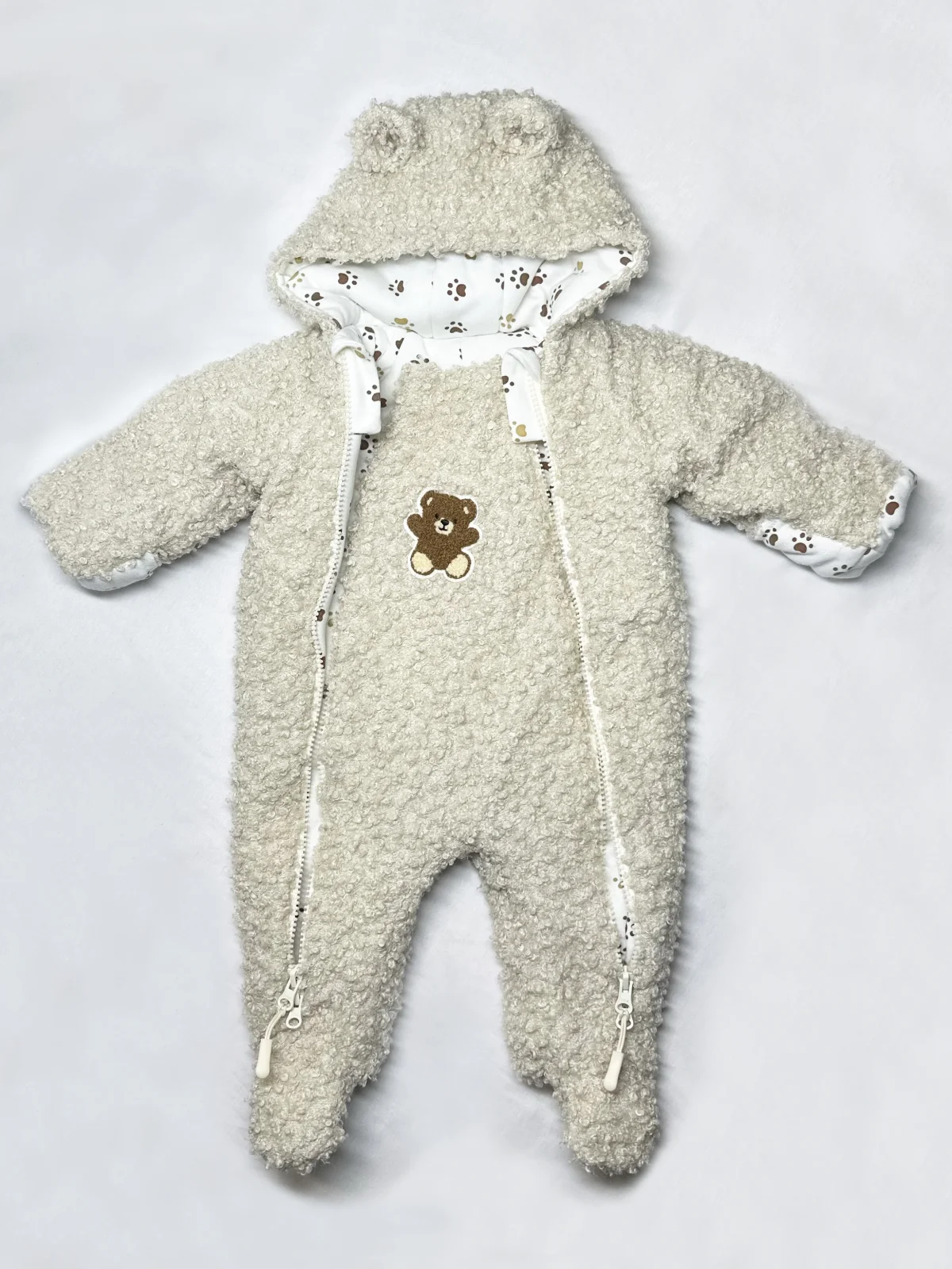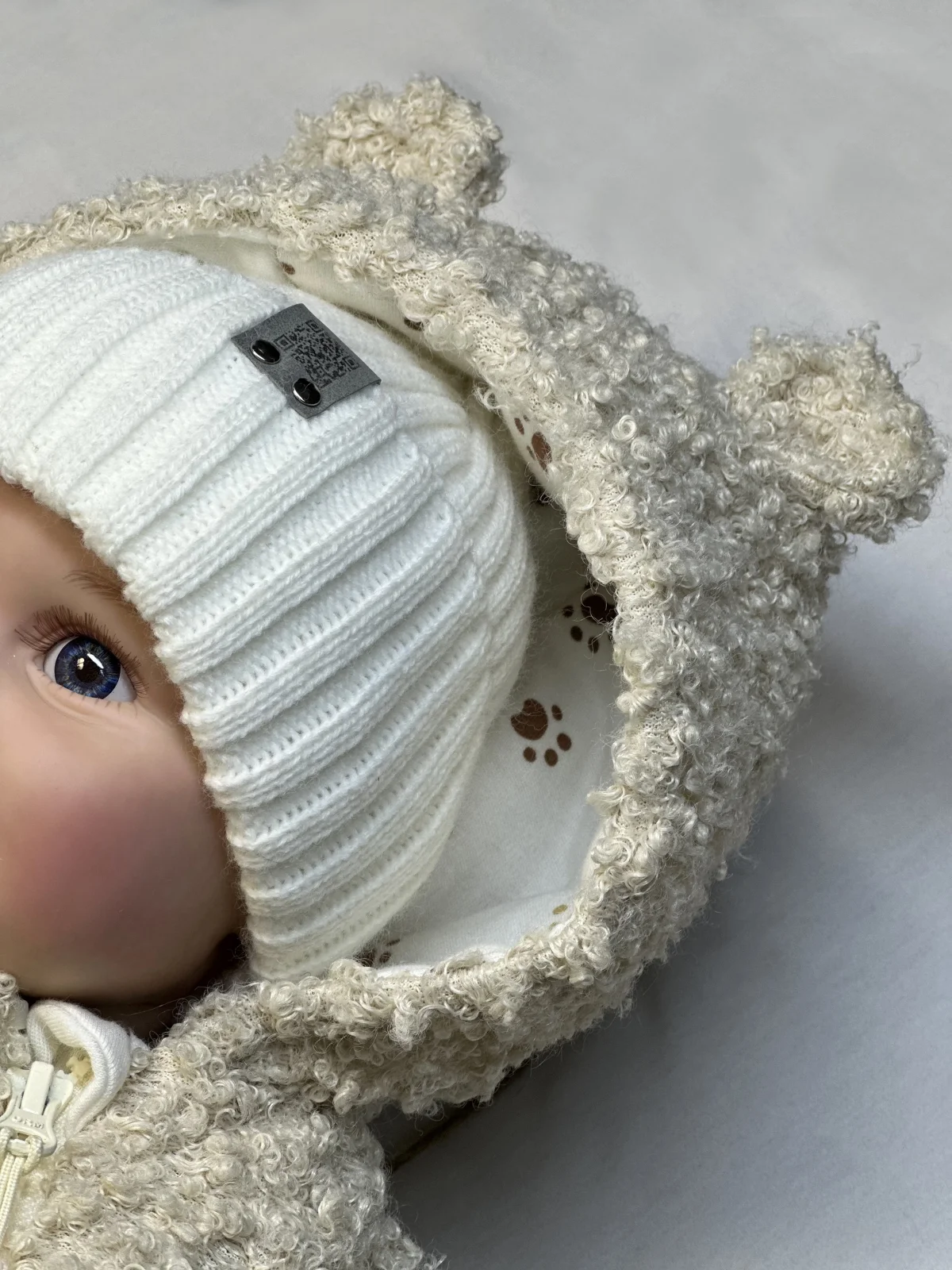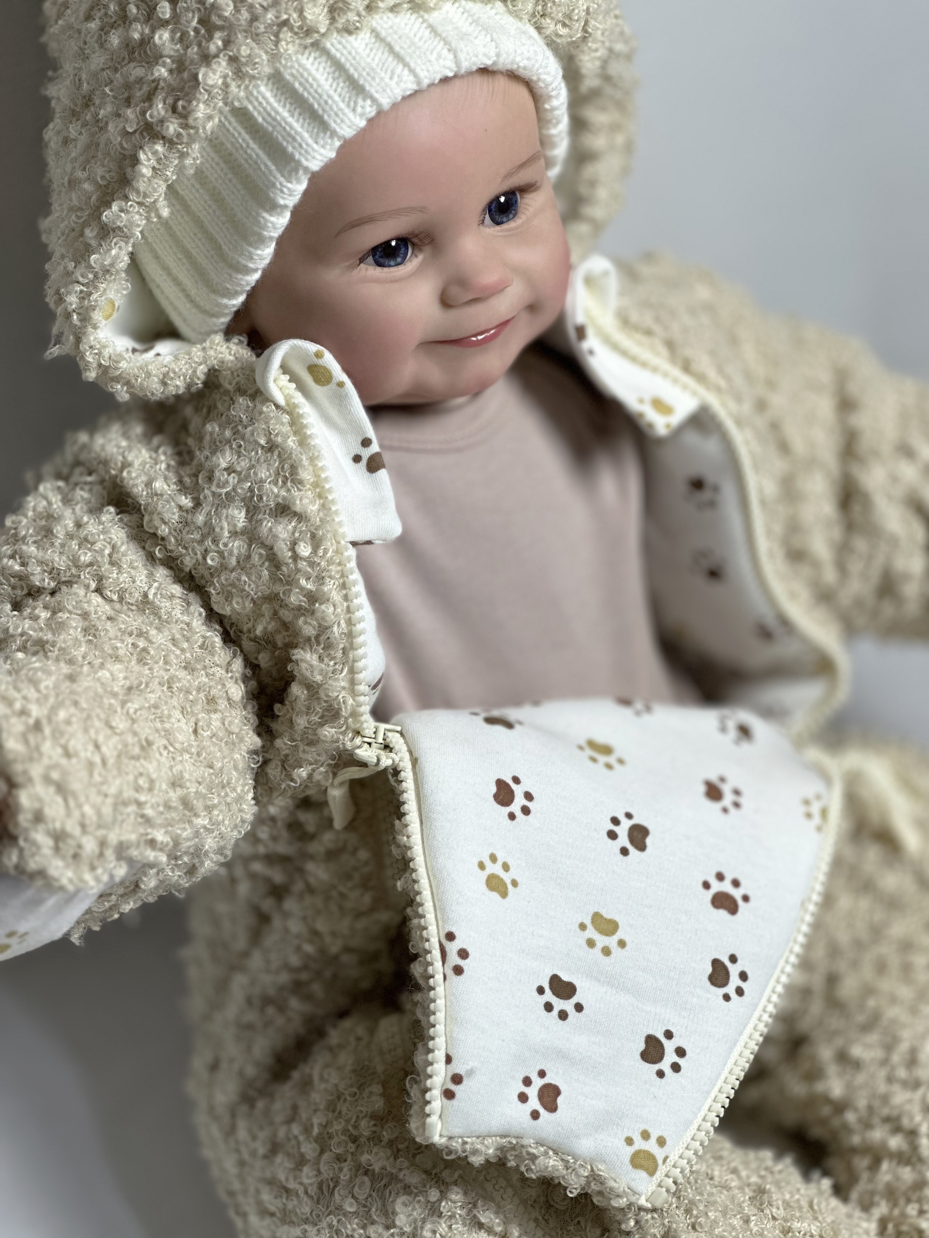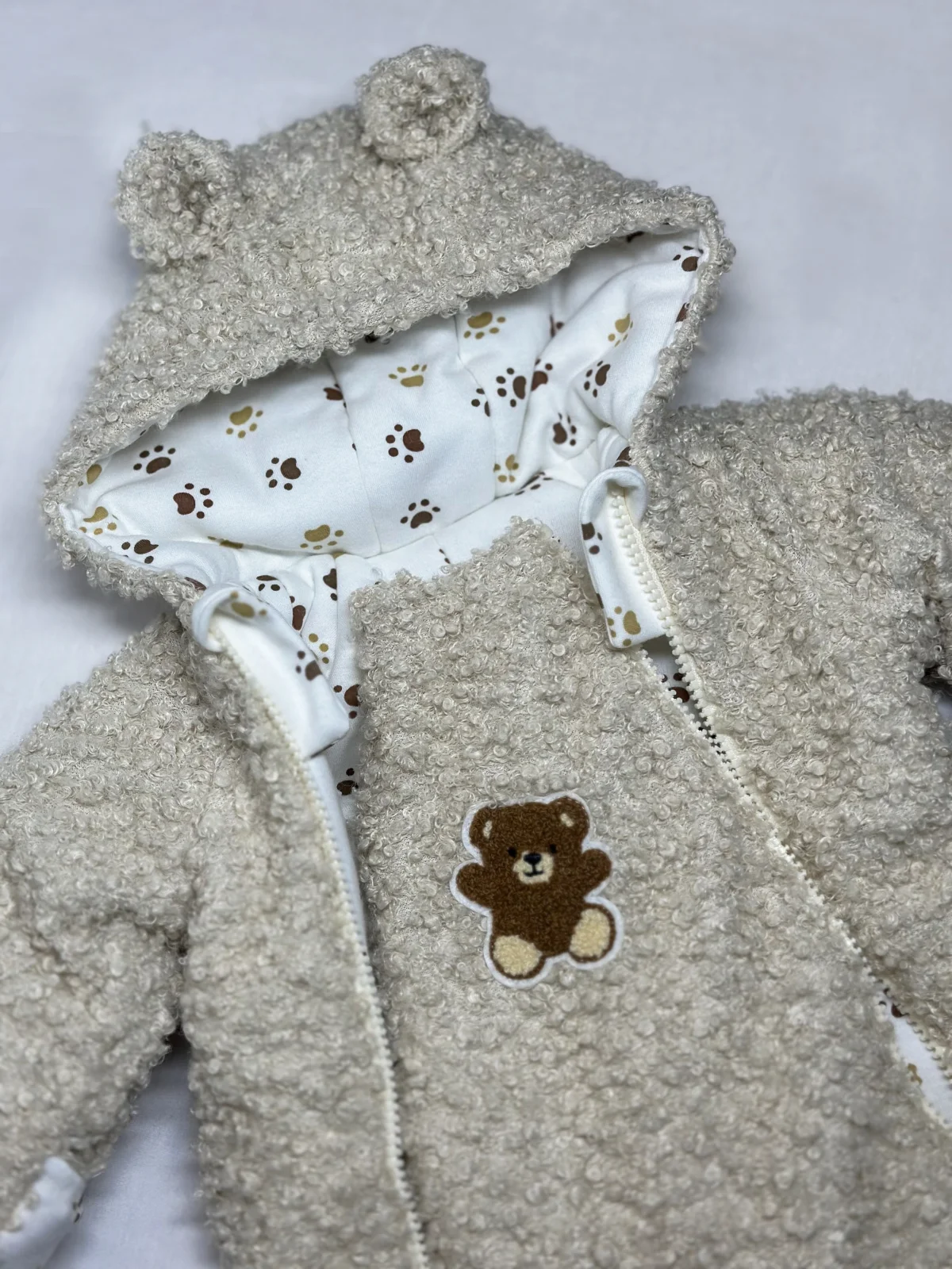 Комбинезон оснащен двумя молниями для удобного и быстрого одевания, а капюшон украшен милыми ушками медведя, придавая образу особую милоту. Ручки можно закрывать для защиты от холодного ветра или открывать по необходимости. Внутри расположена мягкая подкладка из 100% хлопка с забавным принтом лапок, которая обеспечивает приятное ощущение на ощупь и дополнительный комфорт.