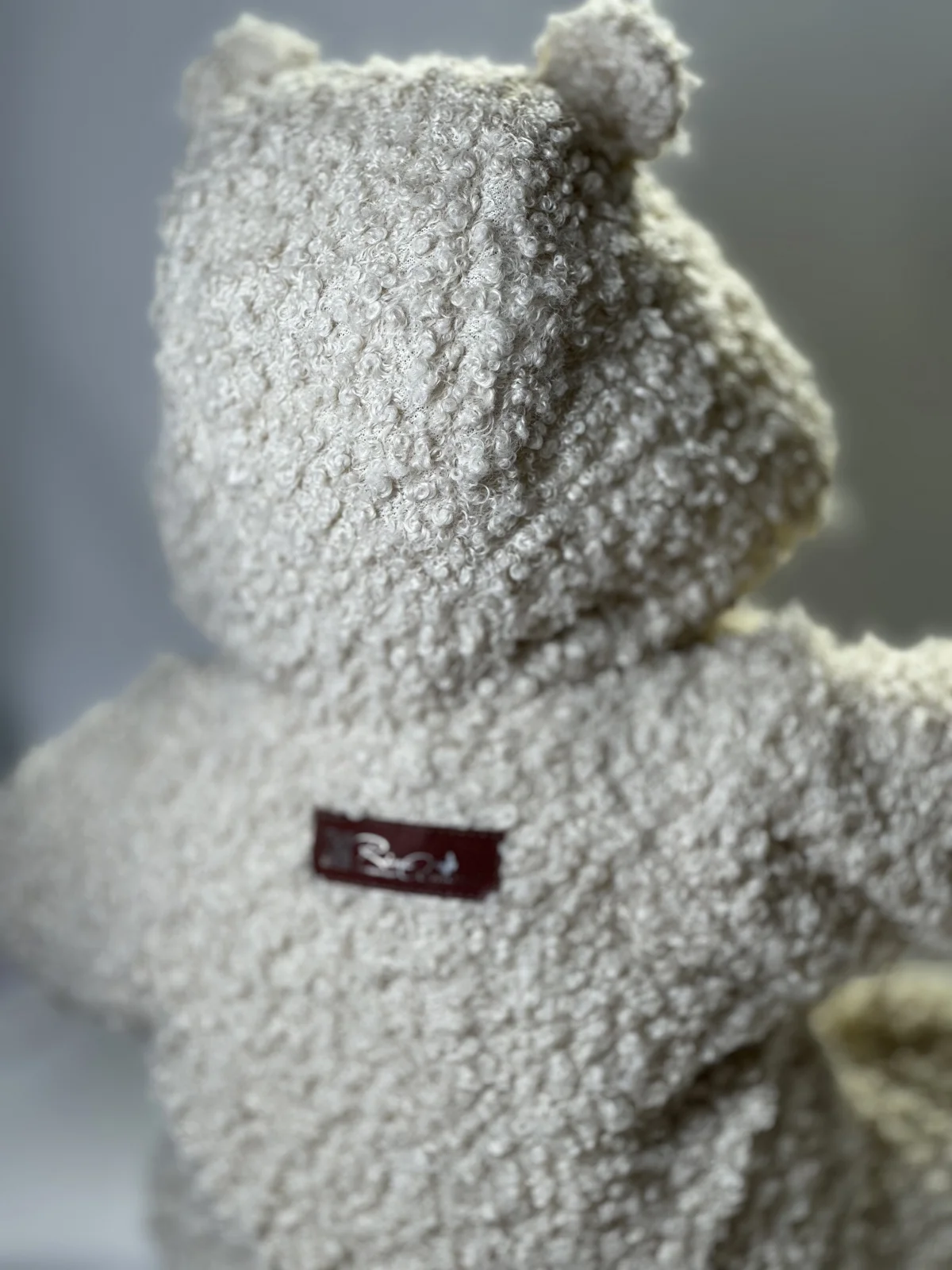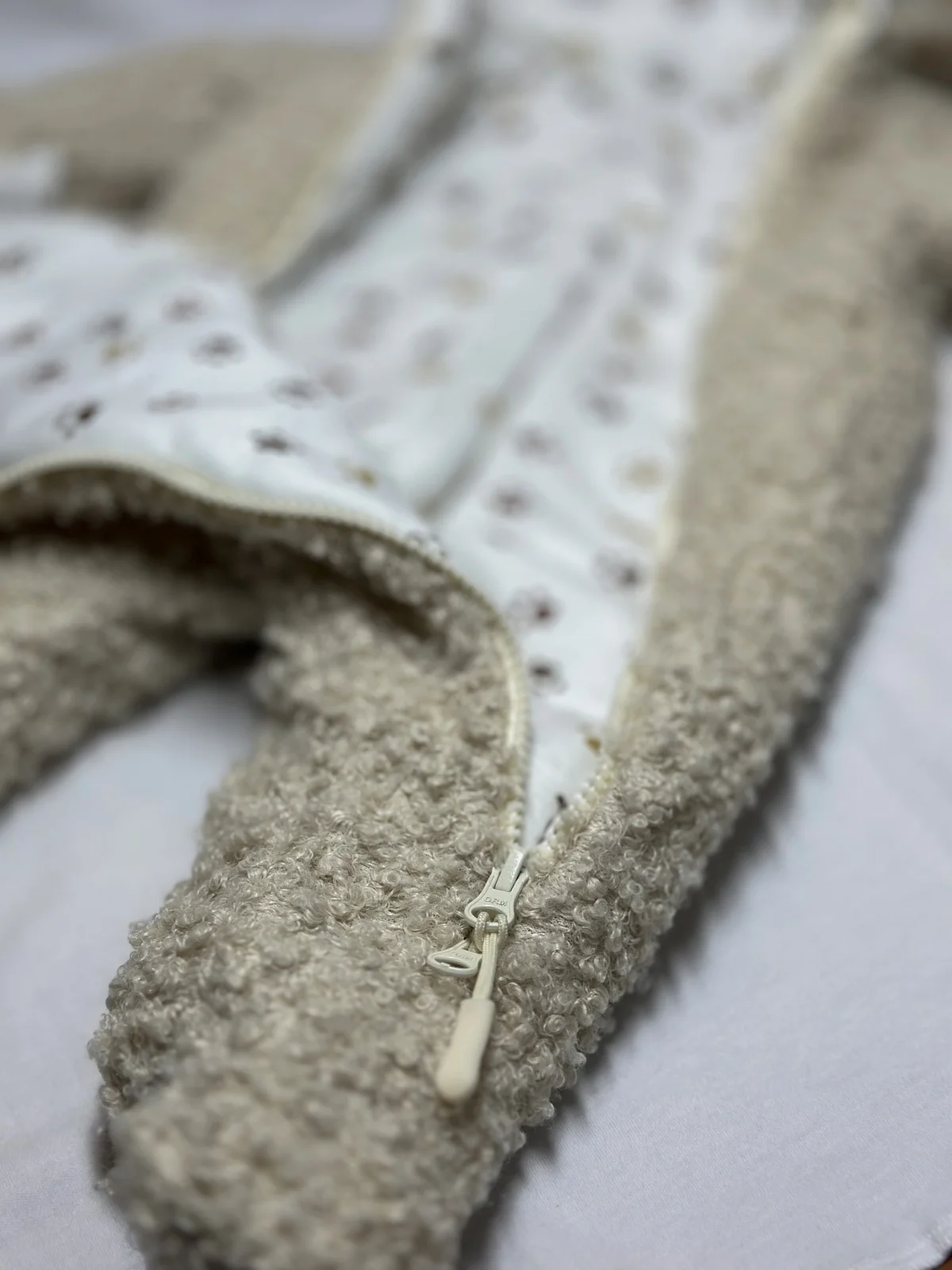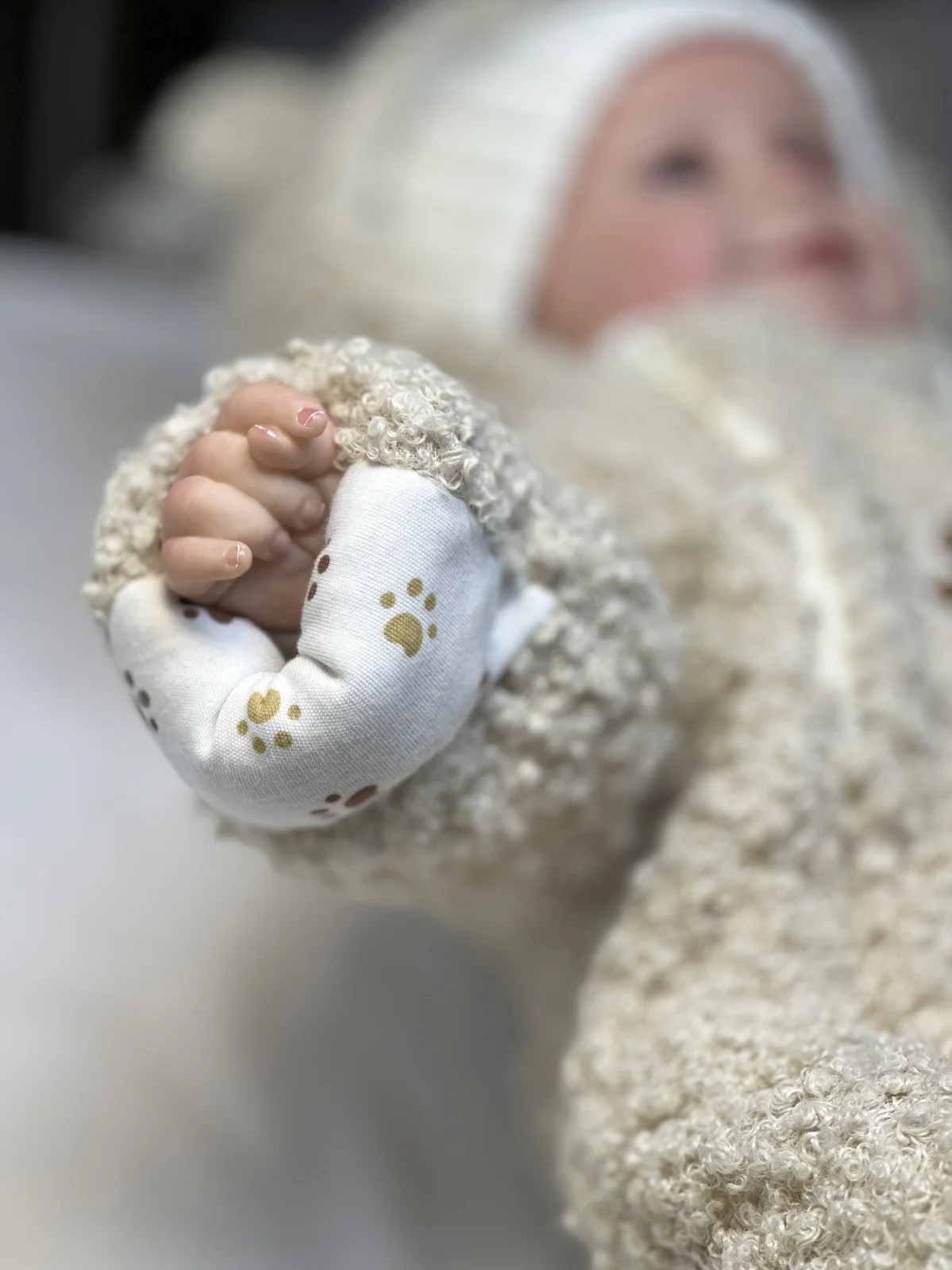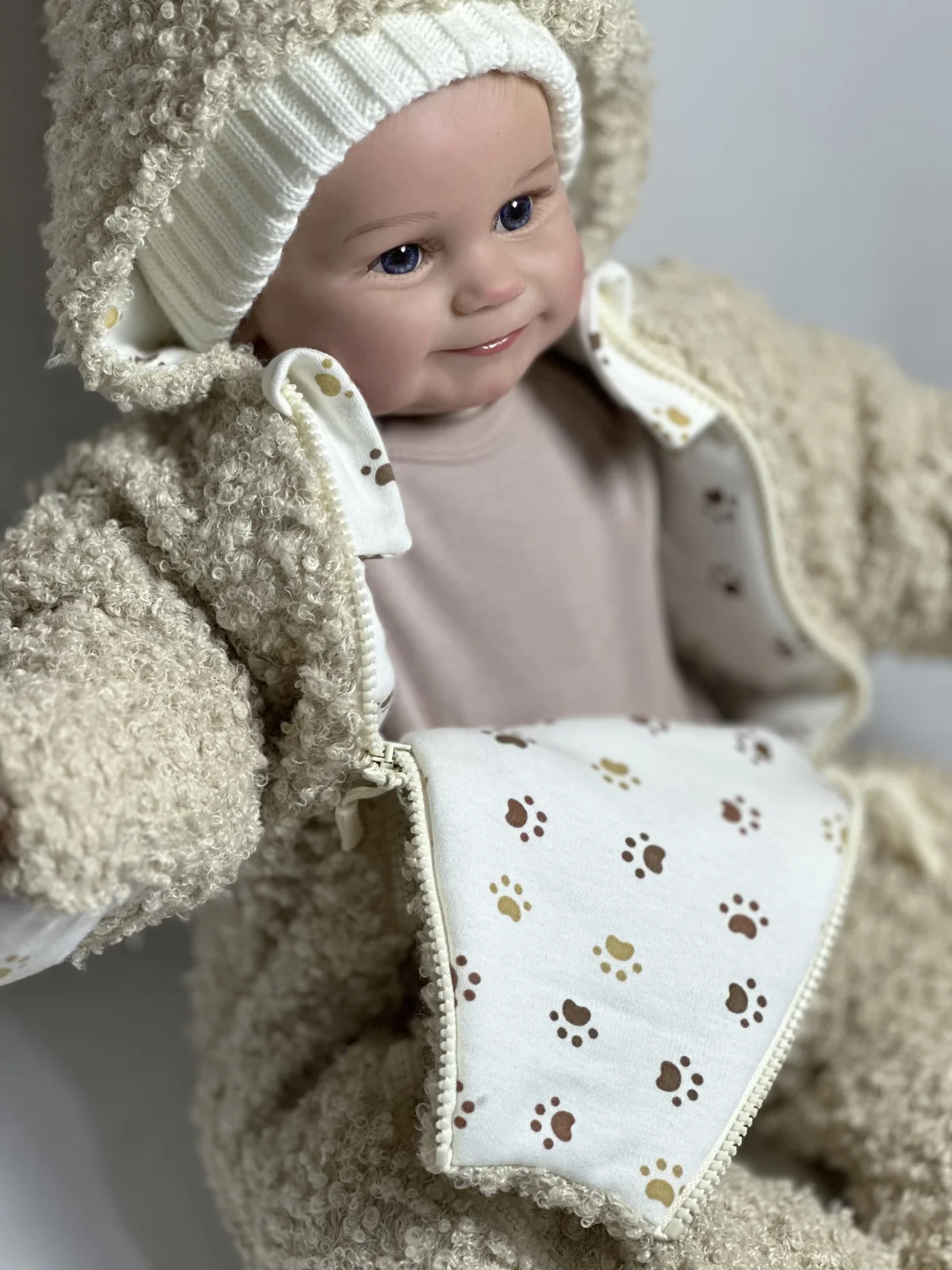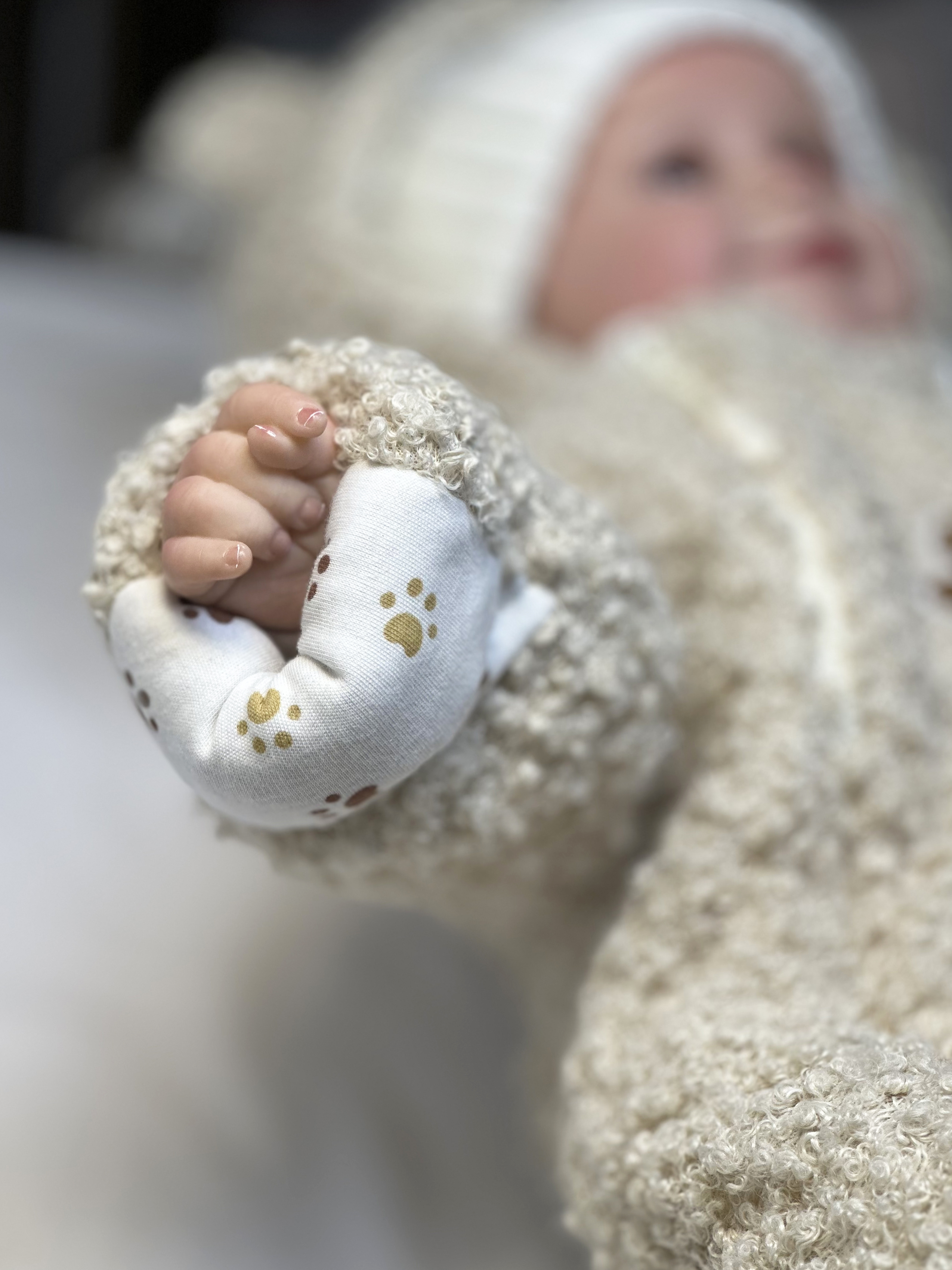 Комбинезон оснащен двумя молниями для удобного и быстрого одевания, а капюшон украшен милыми ушками медведя, придавая образу особую милоту. Ручки можно закрывать для защиты от холодного ветра или открывать по необходимости. Внутри расположена мягкая подкладка из 100% хлопка с забавным принтом лапок, которая обеспечивает приятное ощущение на ощупь и дополнительный комфорт.