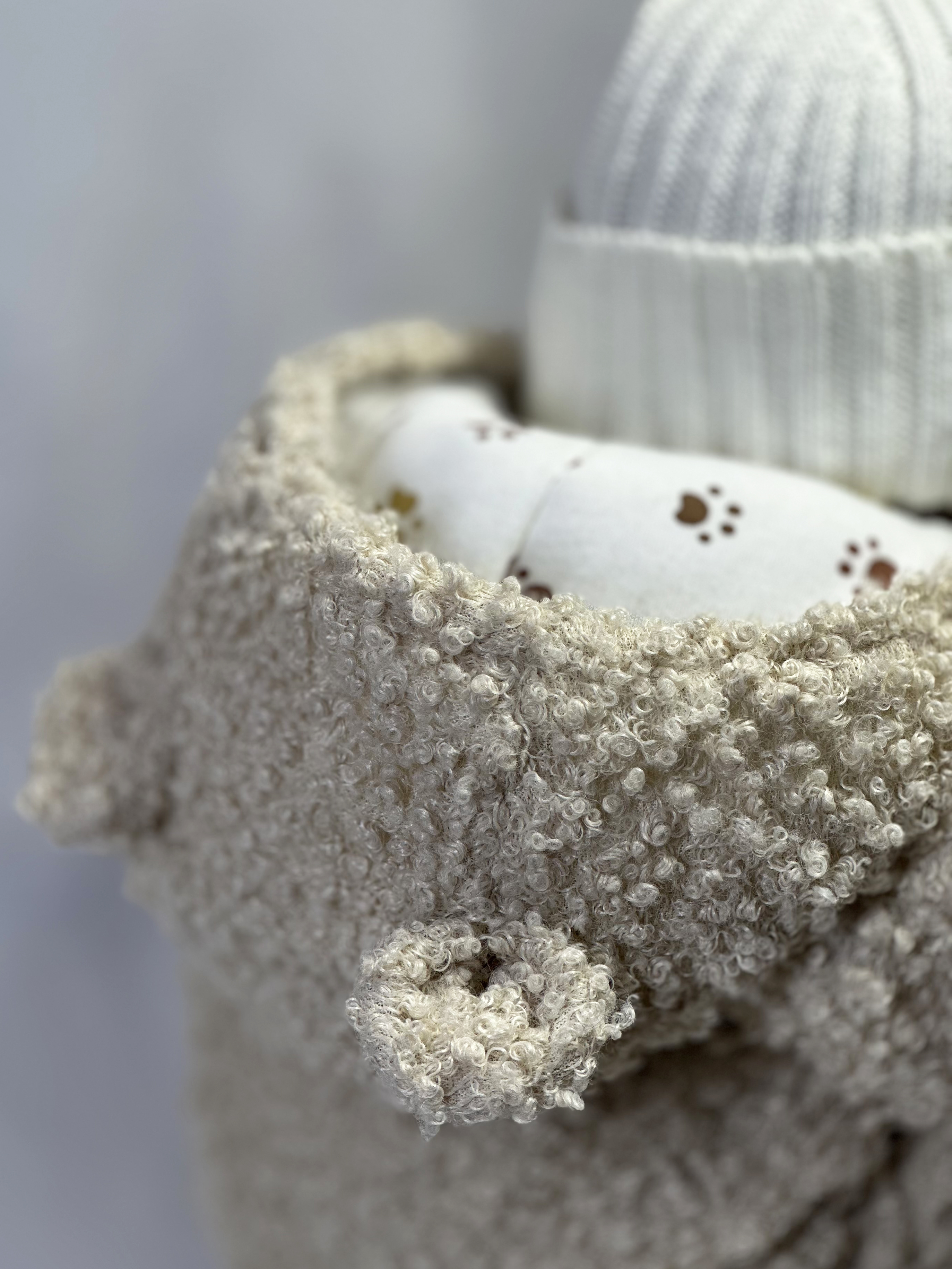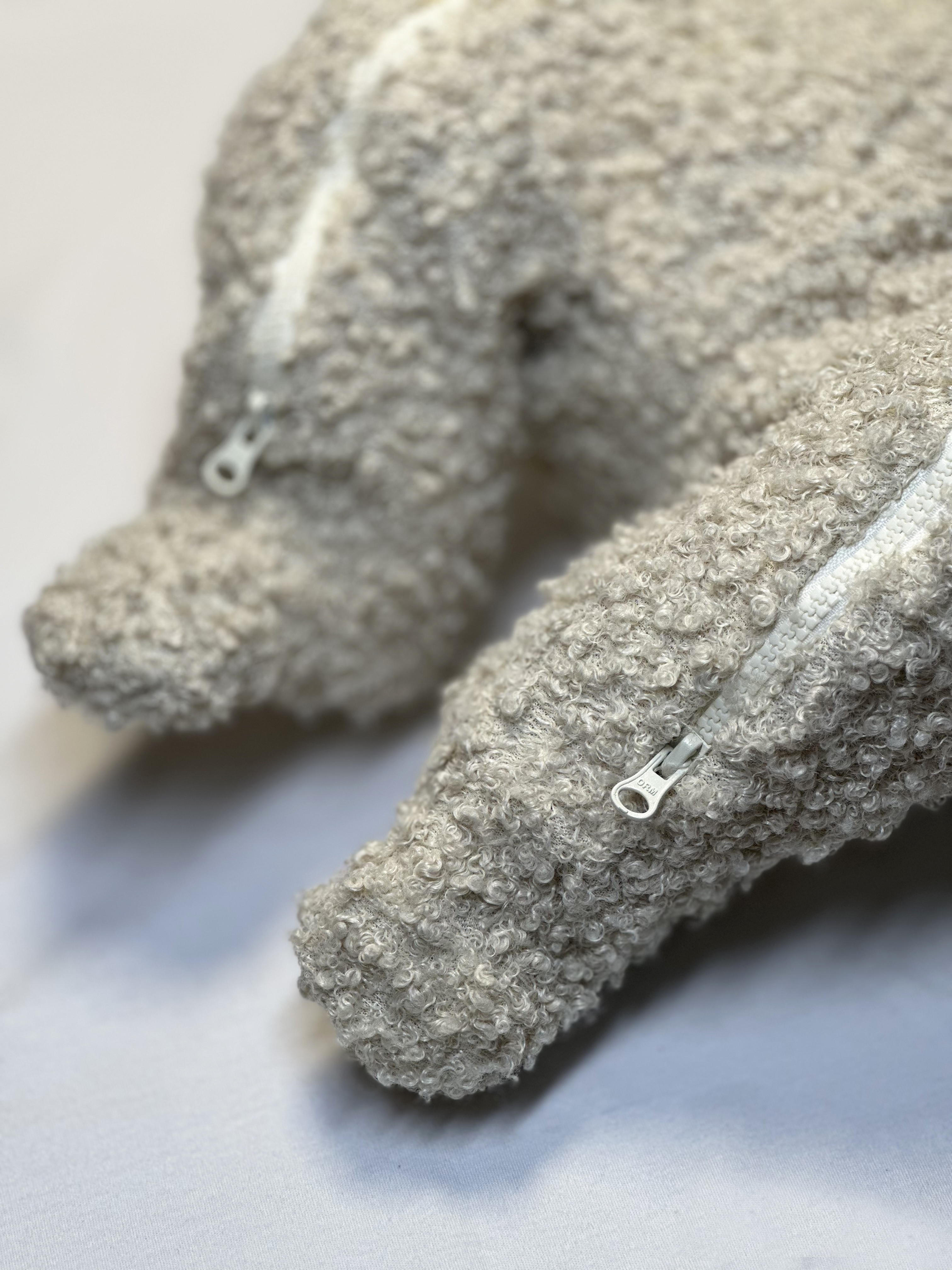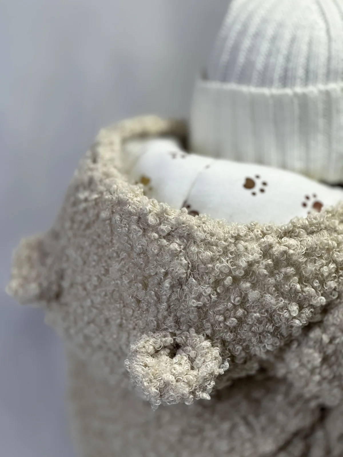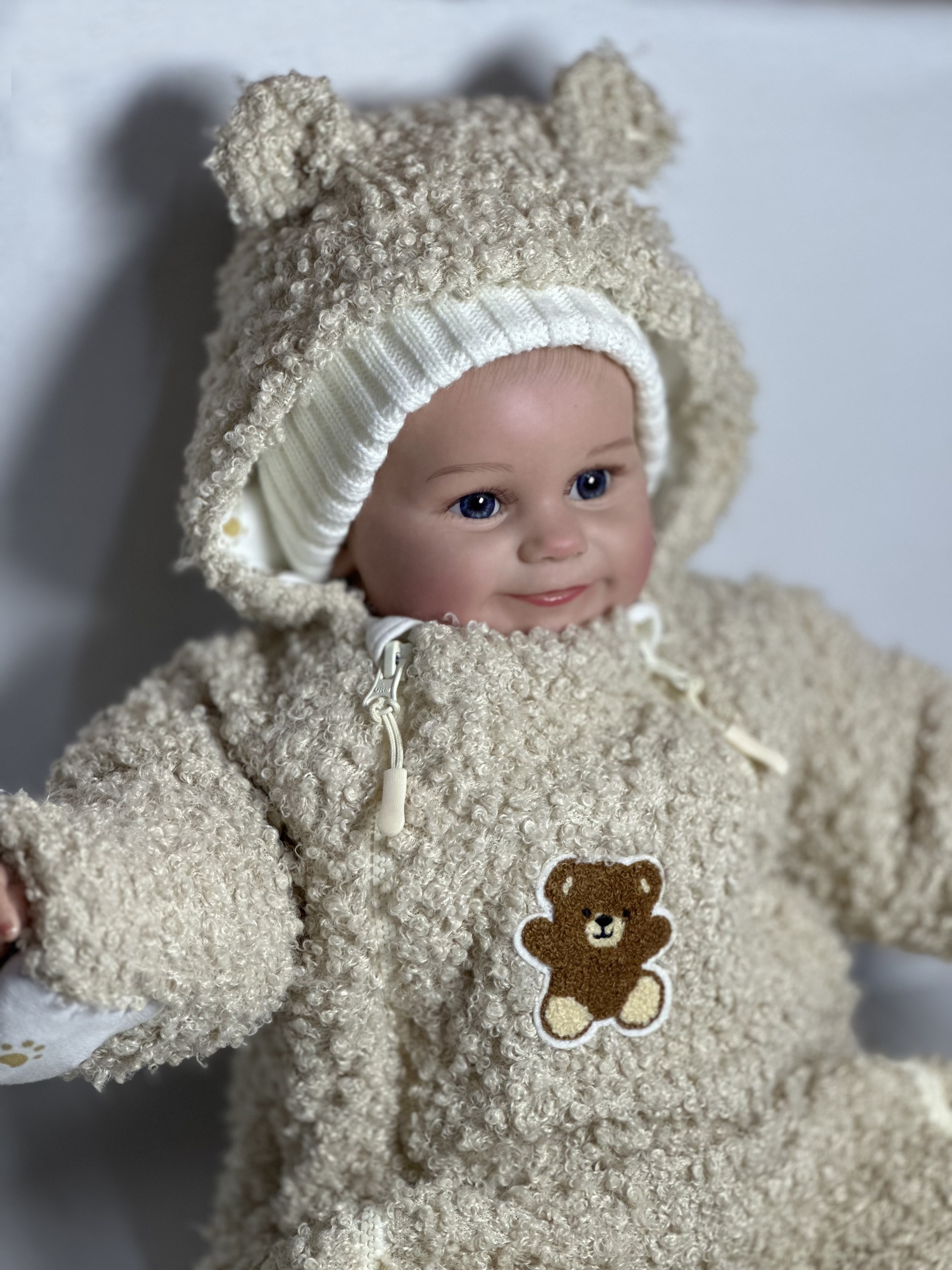 Комбинезон оснащен двумя молниями для удобного и быстрого одевания, а капюшон украшен милыми ушками медведя, придавая образу особую милоту. Ручки можно закрывать для защиты от холодного ветра или открывать по необходимости. Внутри расположена мягкая подкладка из 100% хлопка с забавным принтом лапок, которая обеспечивает приятное ощущение на ощупь и дополнительный комфорт.