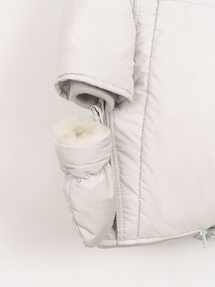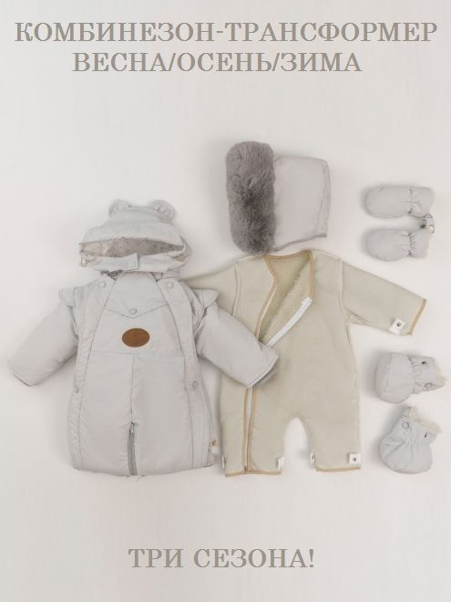 В состав изделия входят: комбинезон трансформер для новорожденных демисезонный, демисезонный капюшон, зимний меховой вкладыш, зимний капюшон, зимние пинетки, зимние рукавички.