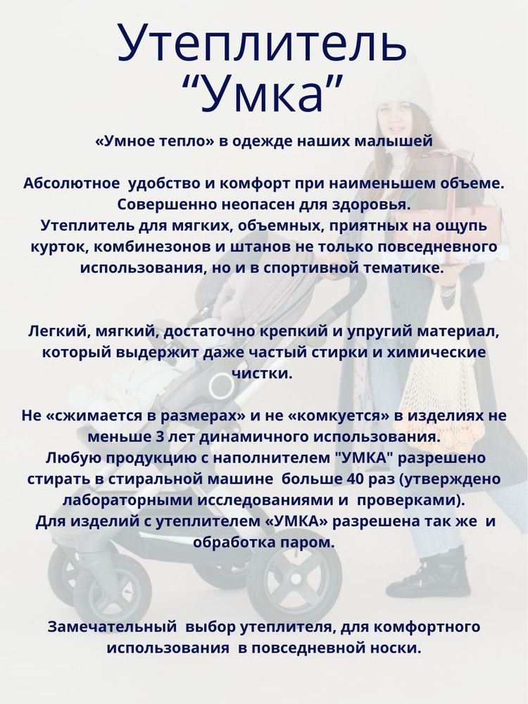 Верх - Плащевая ткань FitSystem Style 18352 100% Полиэстер Плотность ткани 152 г/м2 Подкладка –Трикотажное полотно с рисунком 100% Хлопок Меховой конверт – Мех П/Ш (60% шерсть), Утеплитель – УМКА 100 г/м2 100% Полиэстер
