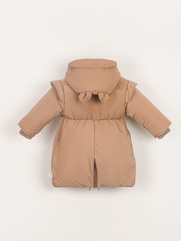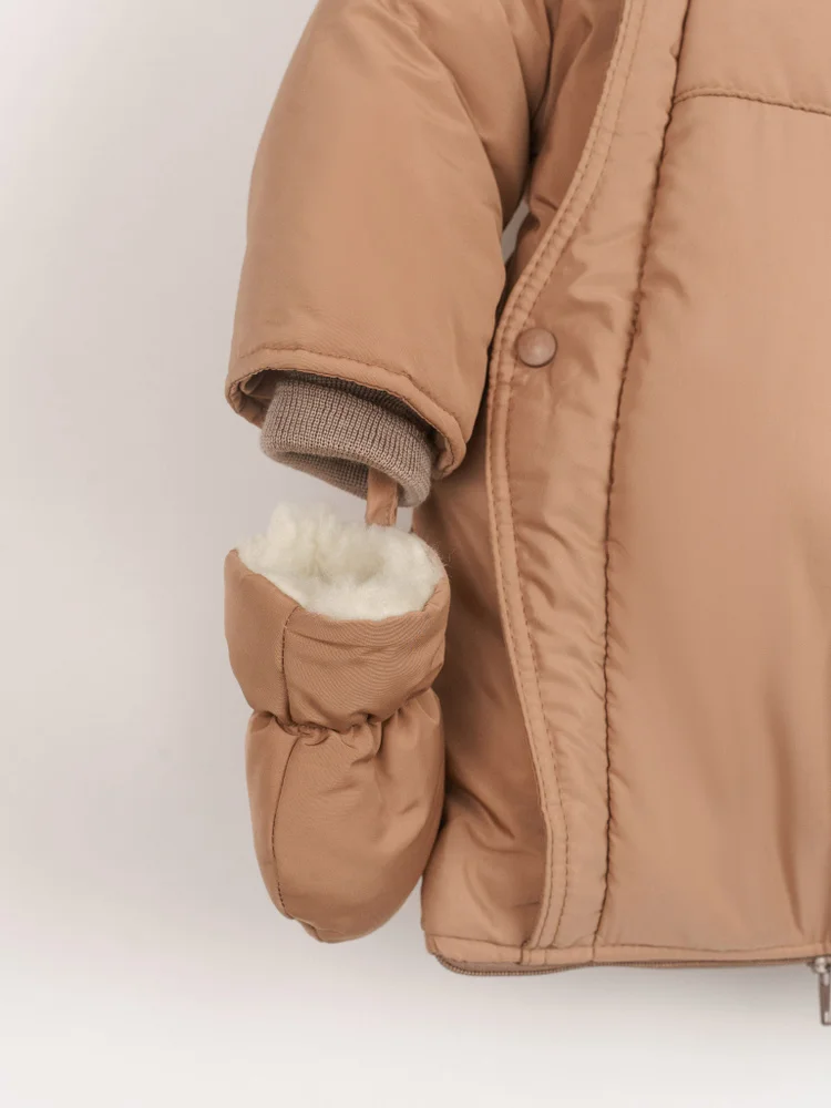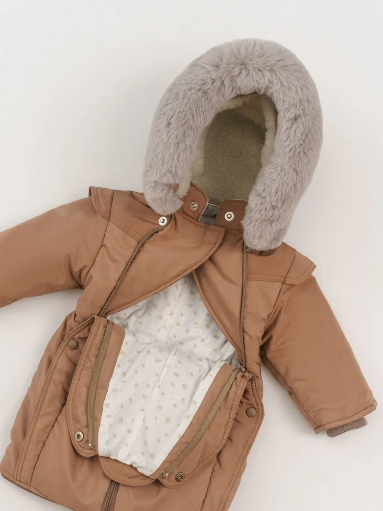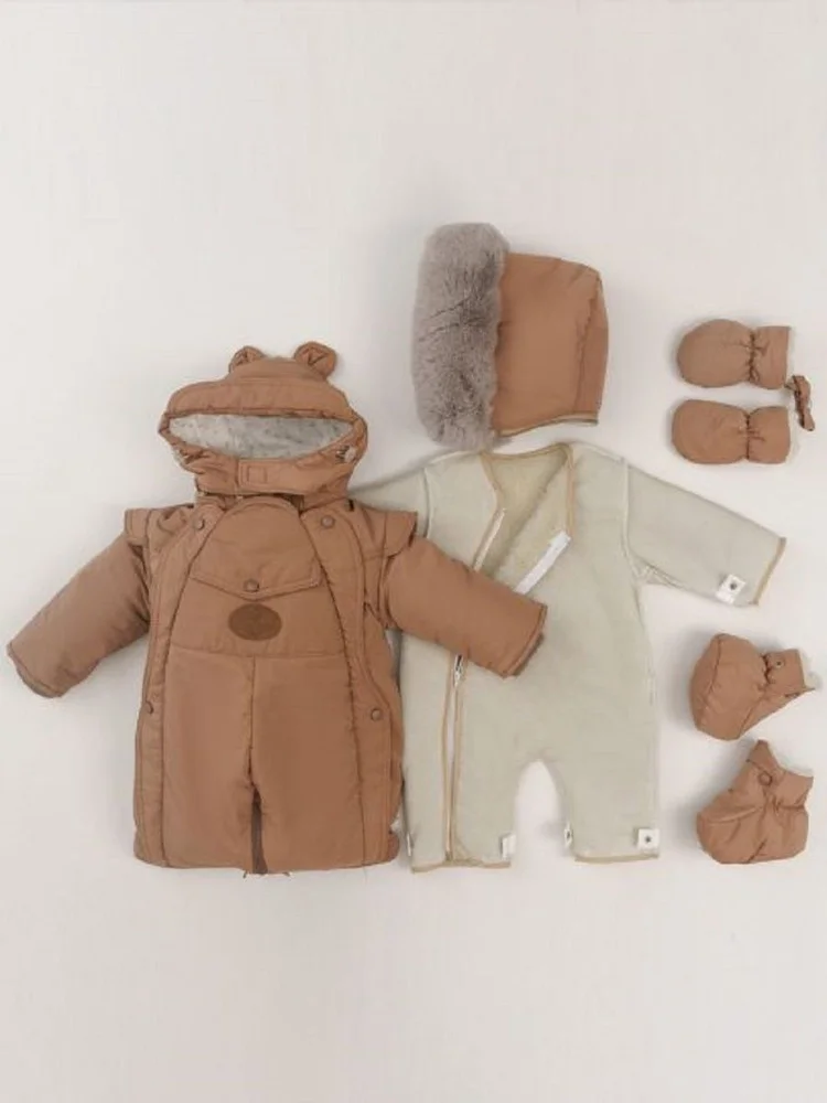 В состав изделия входят: комбинезон трансформер для новорожденных демисезонный, демисезонный капюшон, зимний меховой вкладыш, зимний капюшон, зимние пинетки, зимние рукавички.