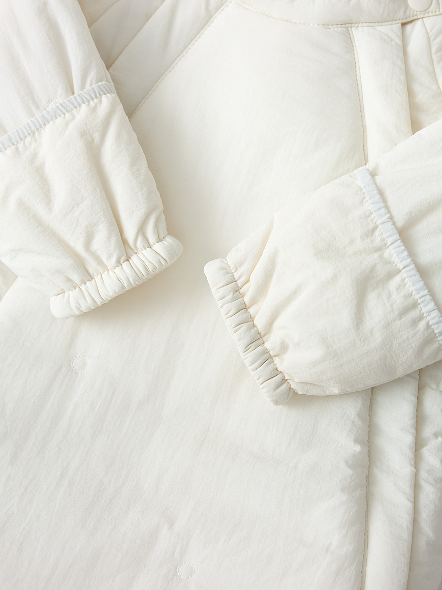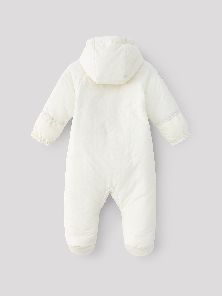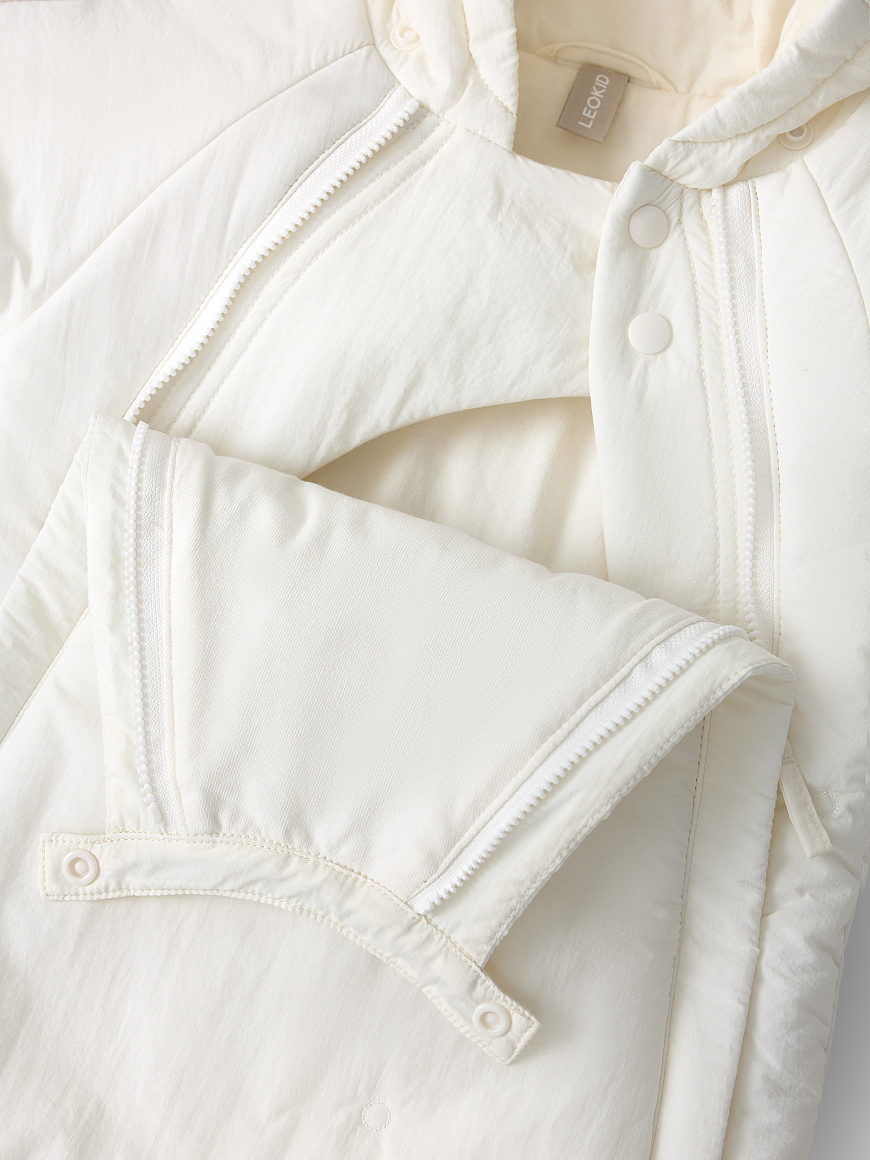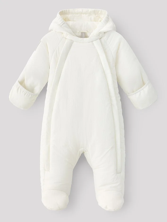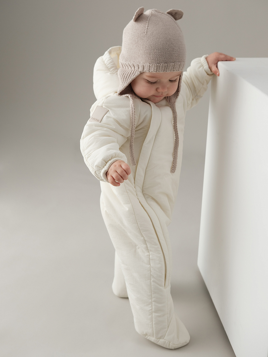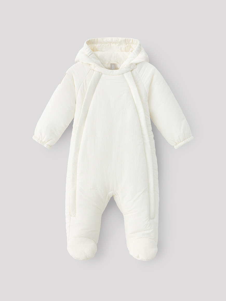 -нежный материал с декоративной стежкой -2 удобные удлиненные молнии с ветрозащитными планками -хлопковая трикотажная подкладка -капюшон с резинкой-утяжкой -закрытые ножки комбинезона -отвороты на рукавах для защиты ручек -легкий листовой утеплитель 80г/m2 -лого-нашивка на рукаве -водоотталкивающее покрытие -подходит новорожденным