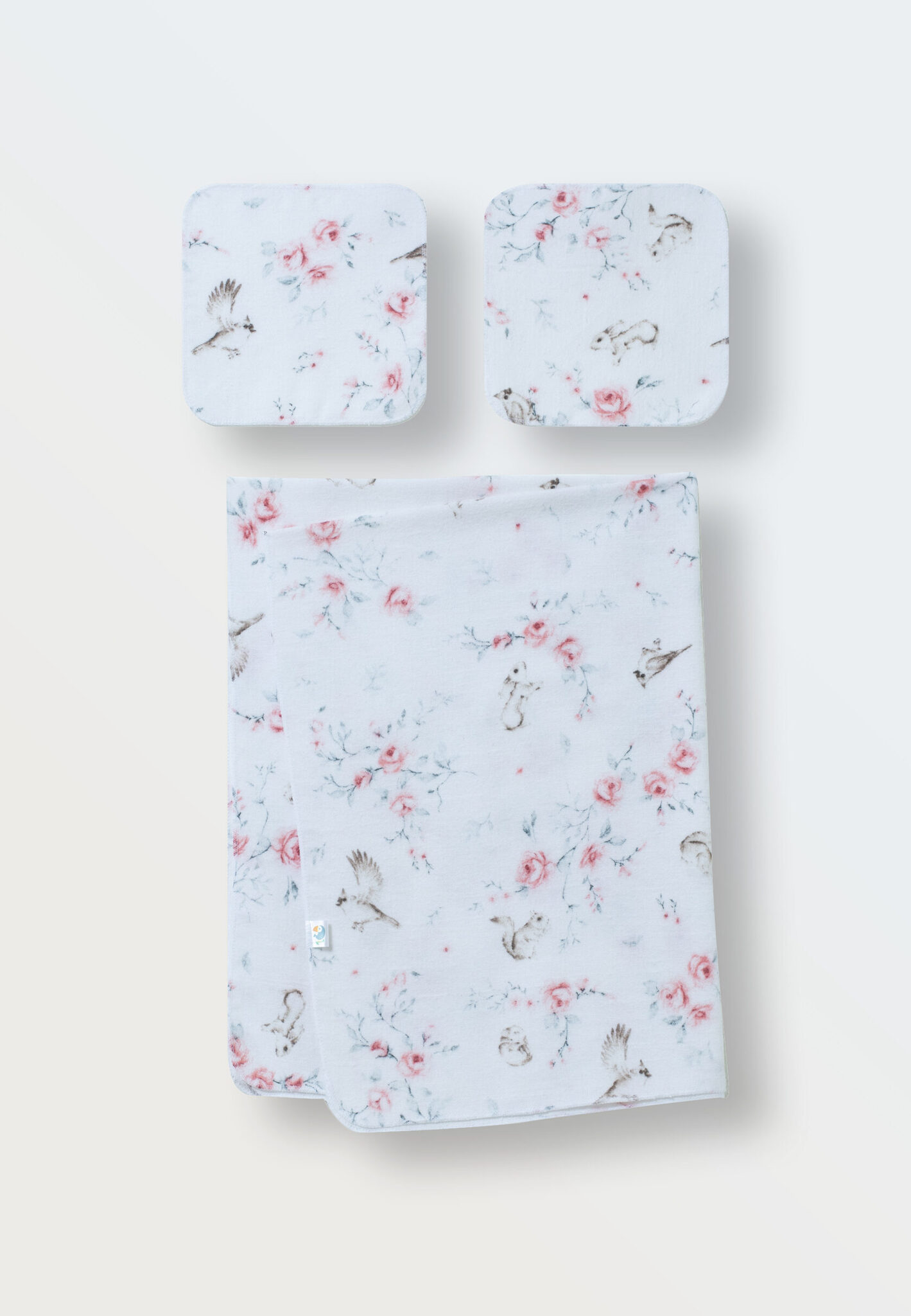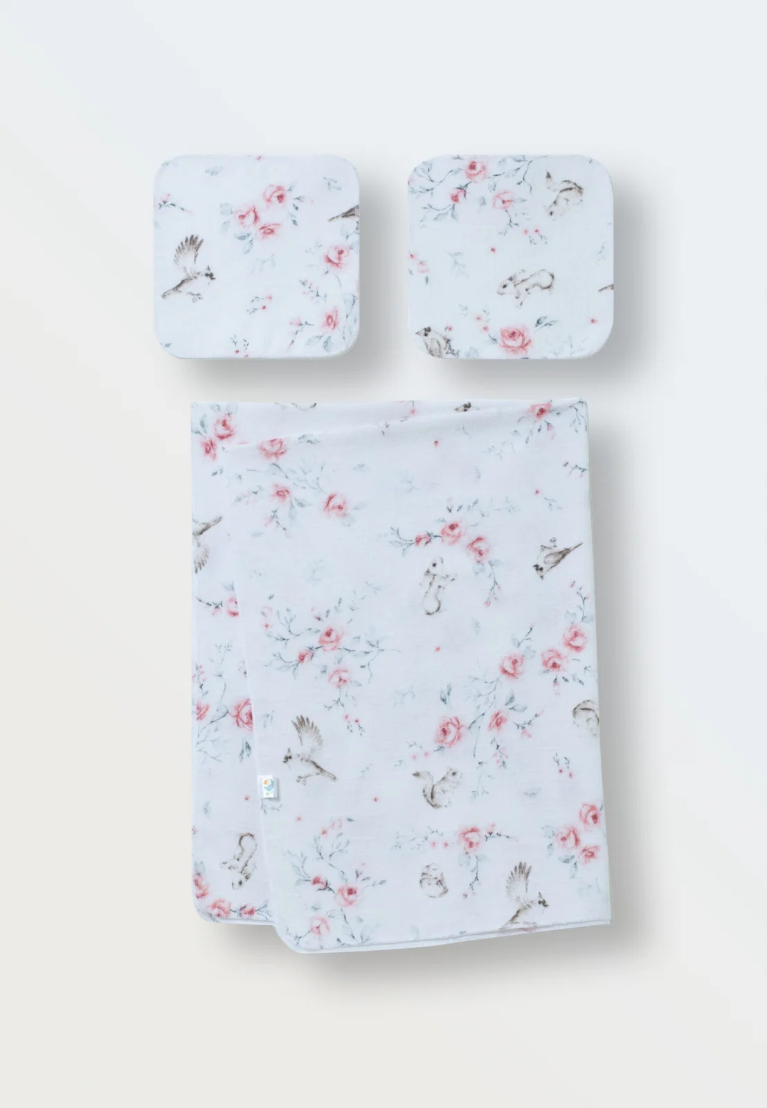 Комплект состоит из фланелевой пеленки большого размера и двух салфеточек для лица и кормления (20х18см.).