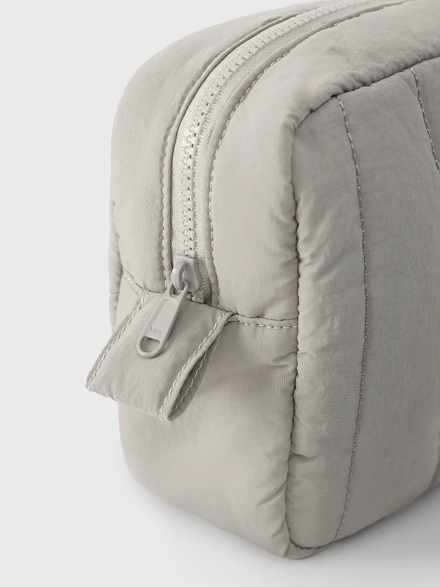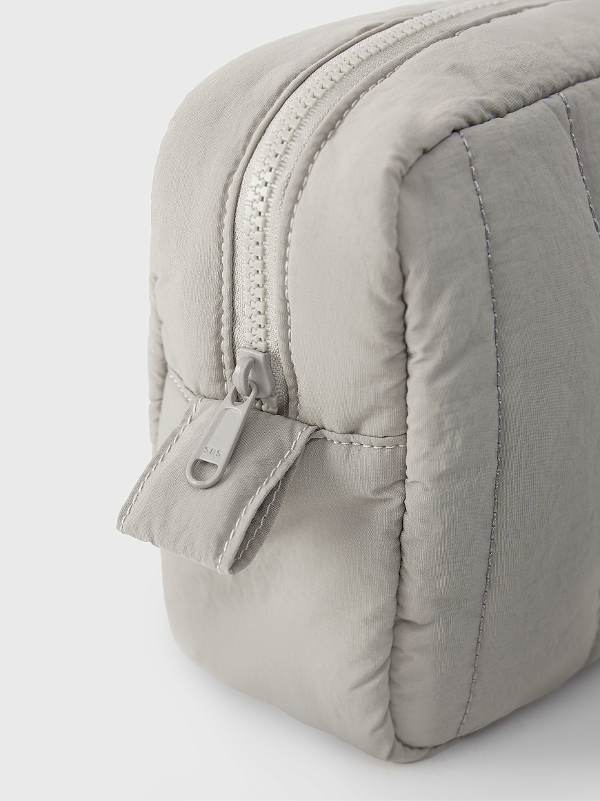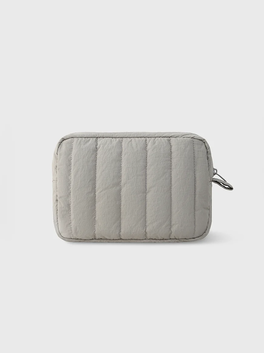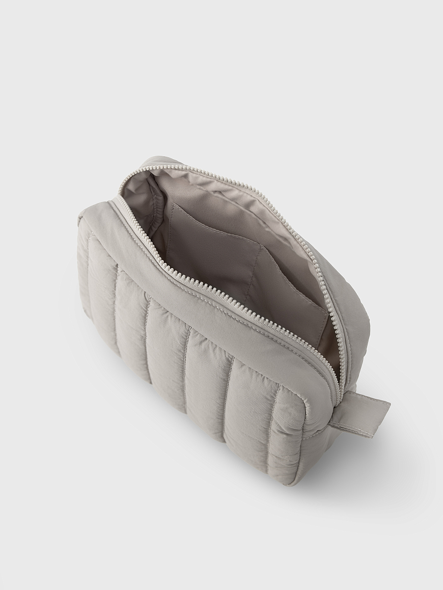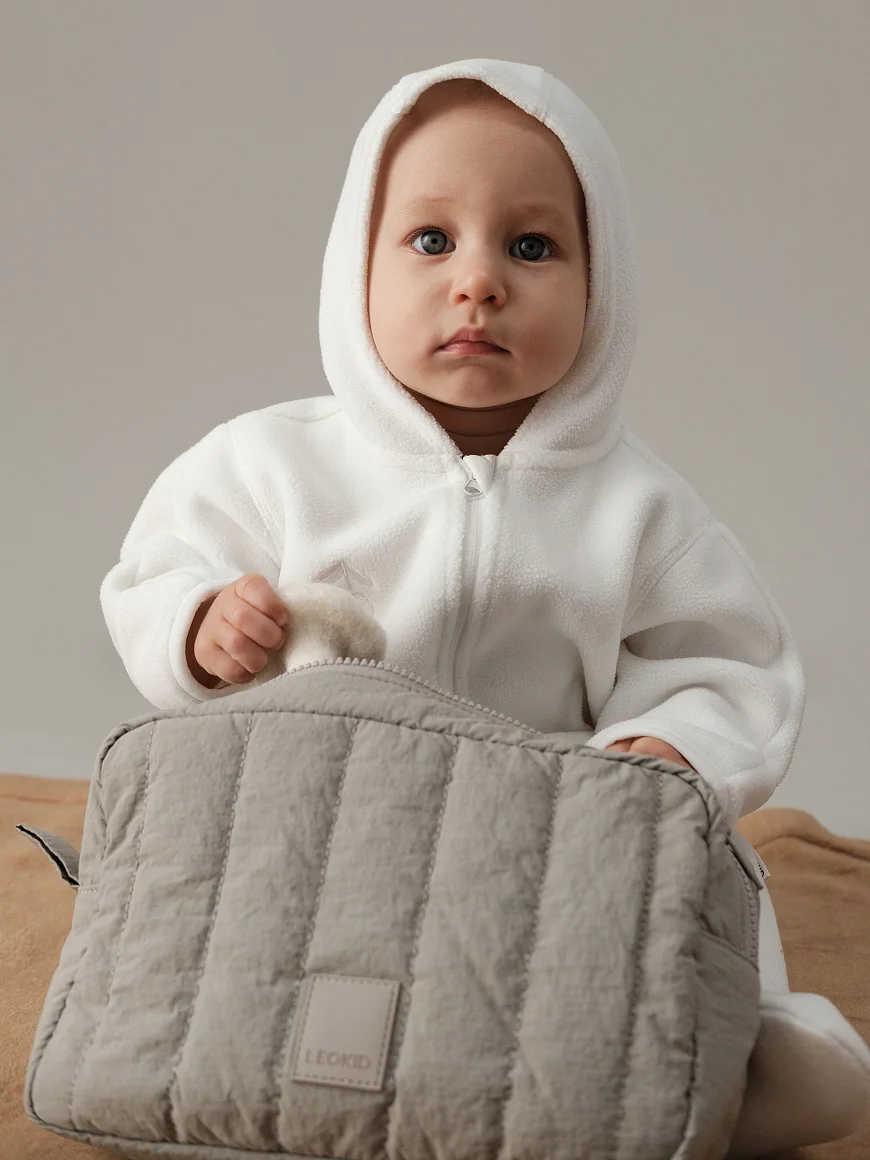 Косметичка из трендовой жатой ткани с вертикальной стежкой — приятная на ощупь, мягкая, но плотная и надежная, да еще и с водоотталкивающим покрытием. Смело берите ее на прогулки с малышом и в путешествия. Внутри — два кармана для организации мелочей, а снаружи — застежка на молнию, чтобы ничего не потерялось. Идеальный комплект с детским рюкзаком Bona — для ваших парных фэмили-луков.