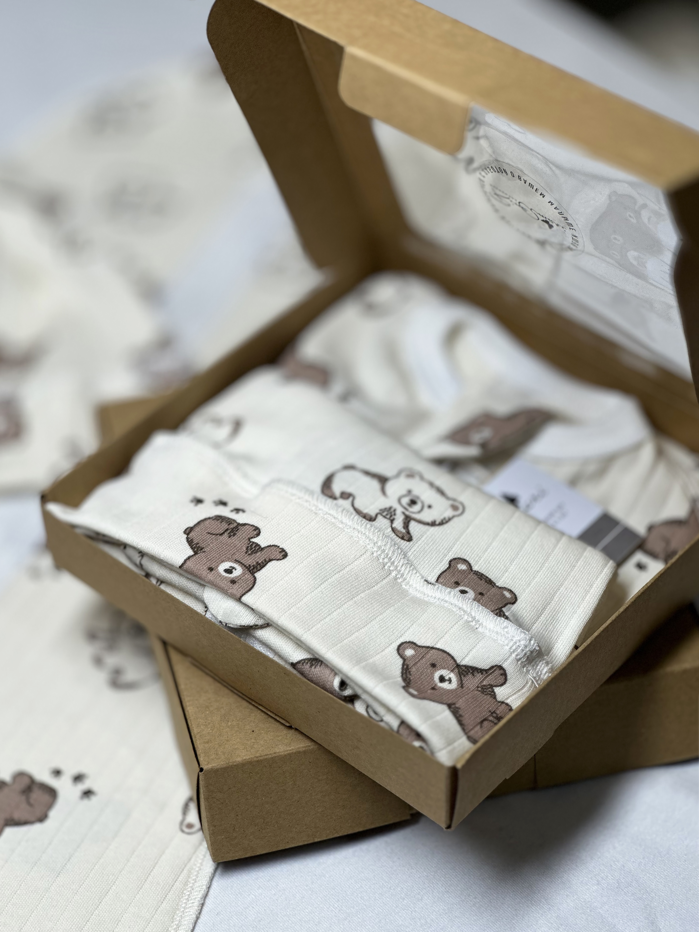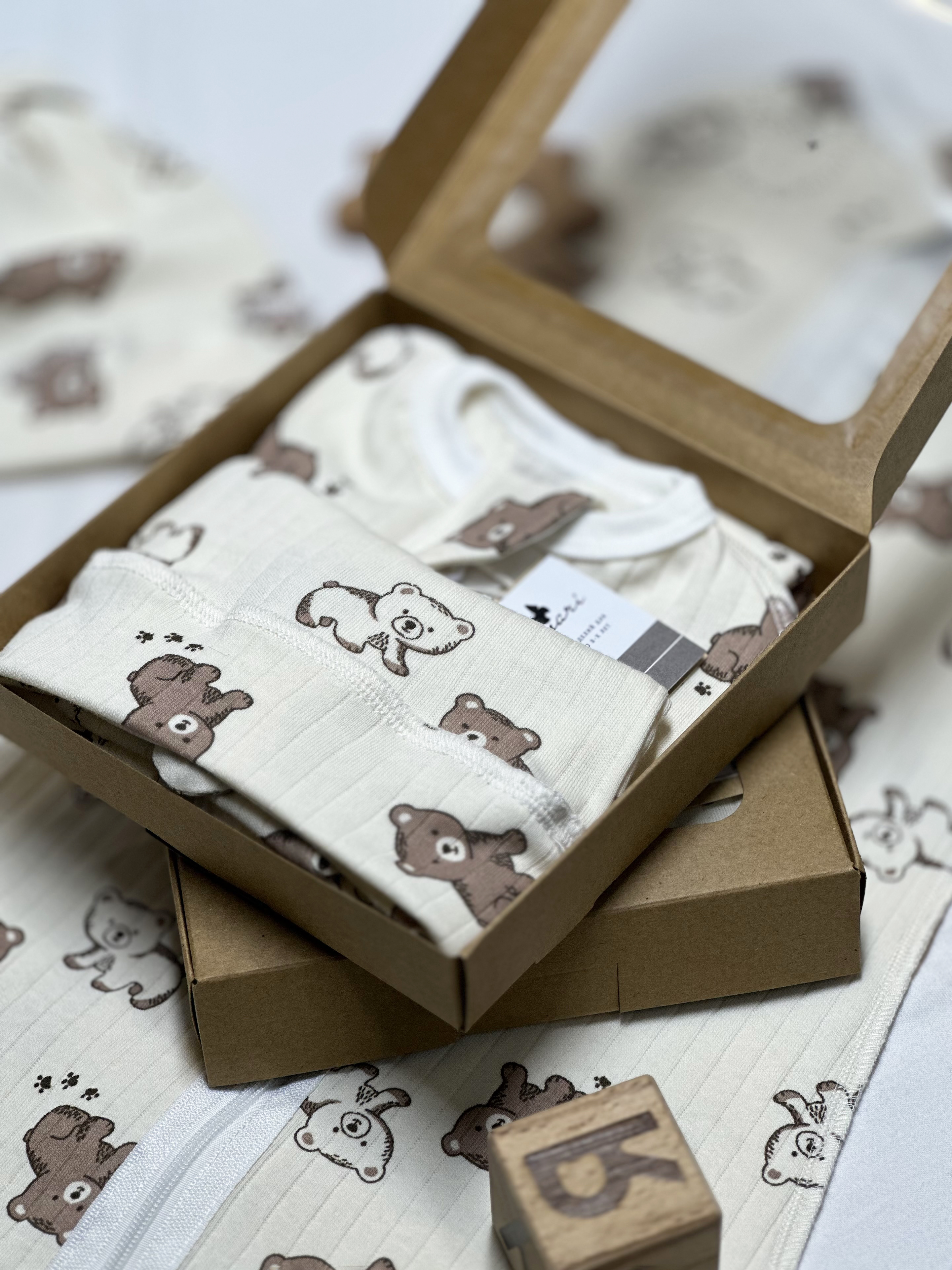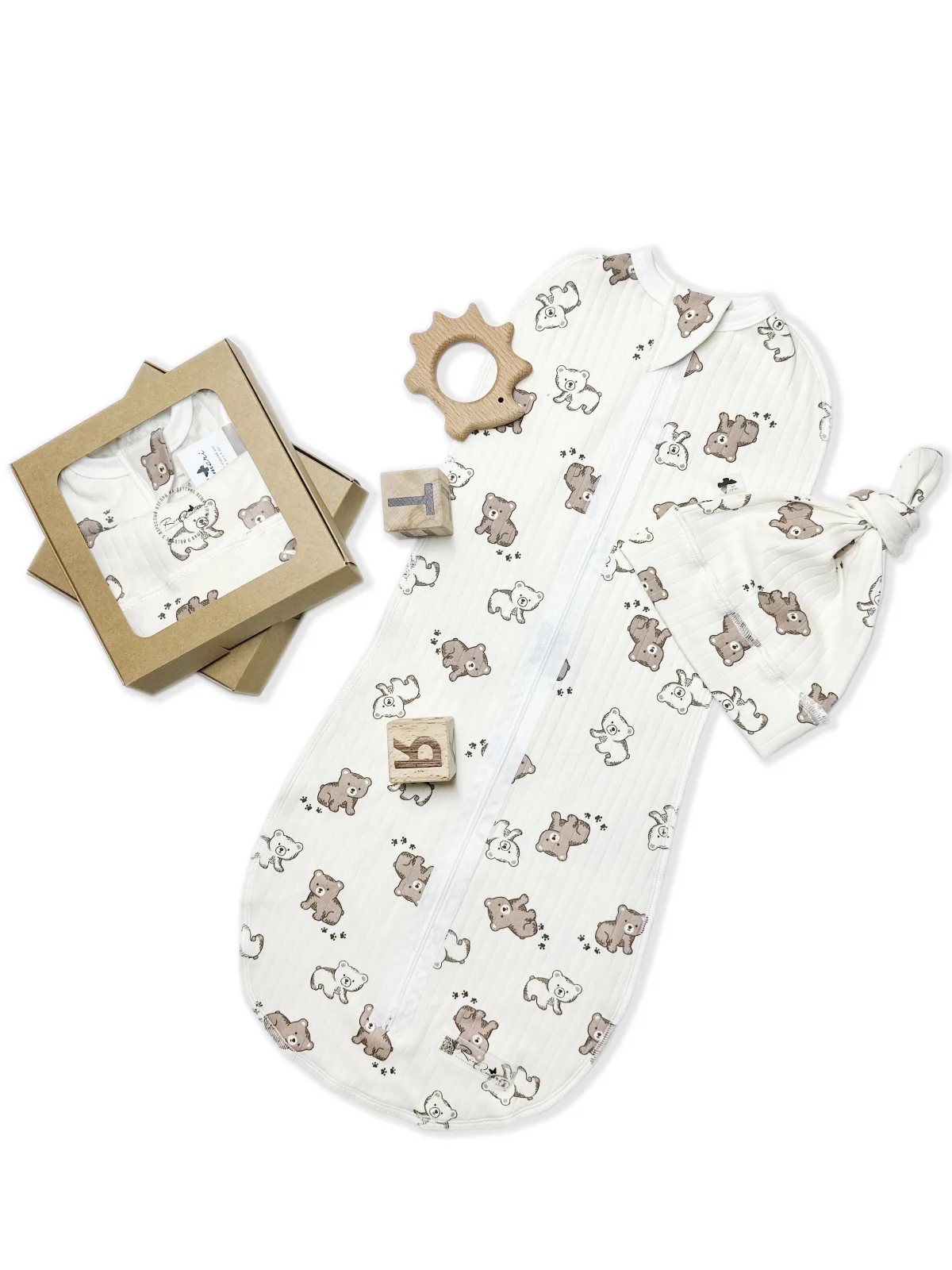 Набор включает уютный пеленальный кокон и стильную шапочку узелок, оформленные в красивой подарочной коробке с милым принтом медвежат. Этот комплект станет отличным подарком для новорожденного и его родителей.