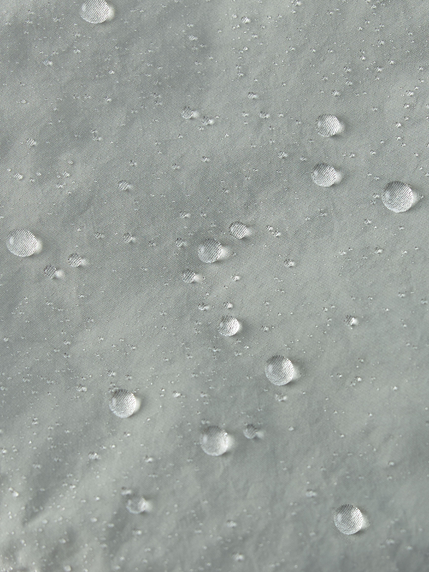 -ткань с жатым эффектом -завязки из основной ткани -легкий листовой утеплитель 50 г/m2 -водоотталкивающая пропитка -лого нашивка сзади