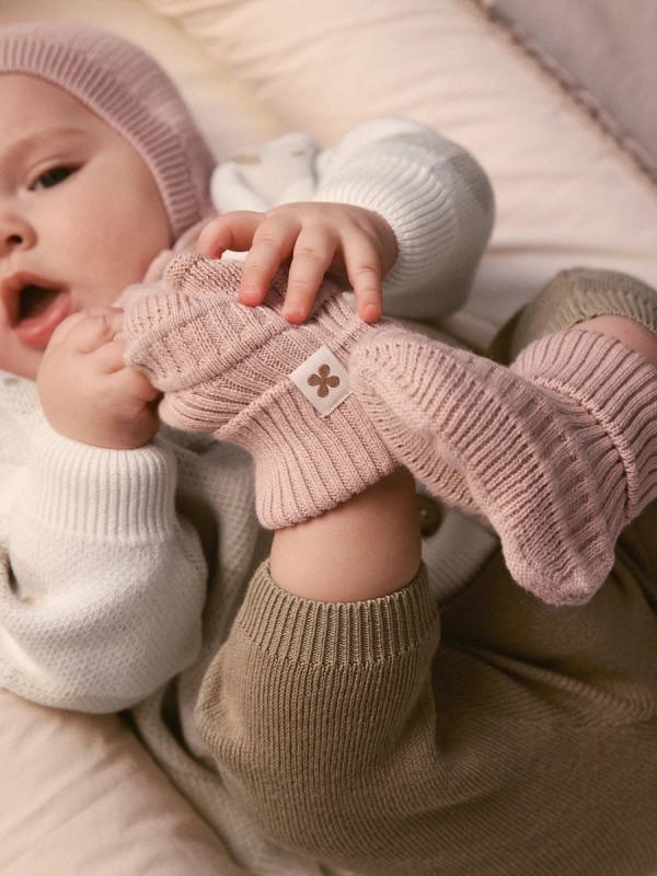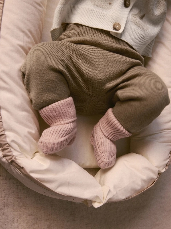 Пинетки связаны в рубчик из нежной хлопковой пряжи.