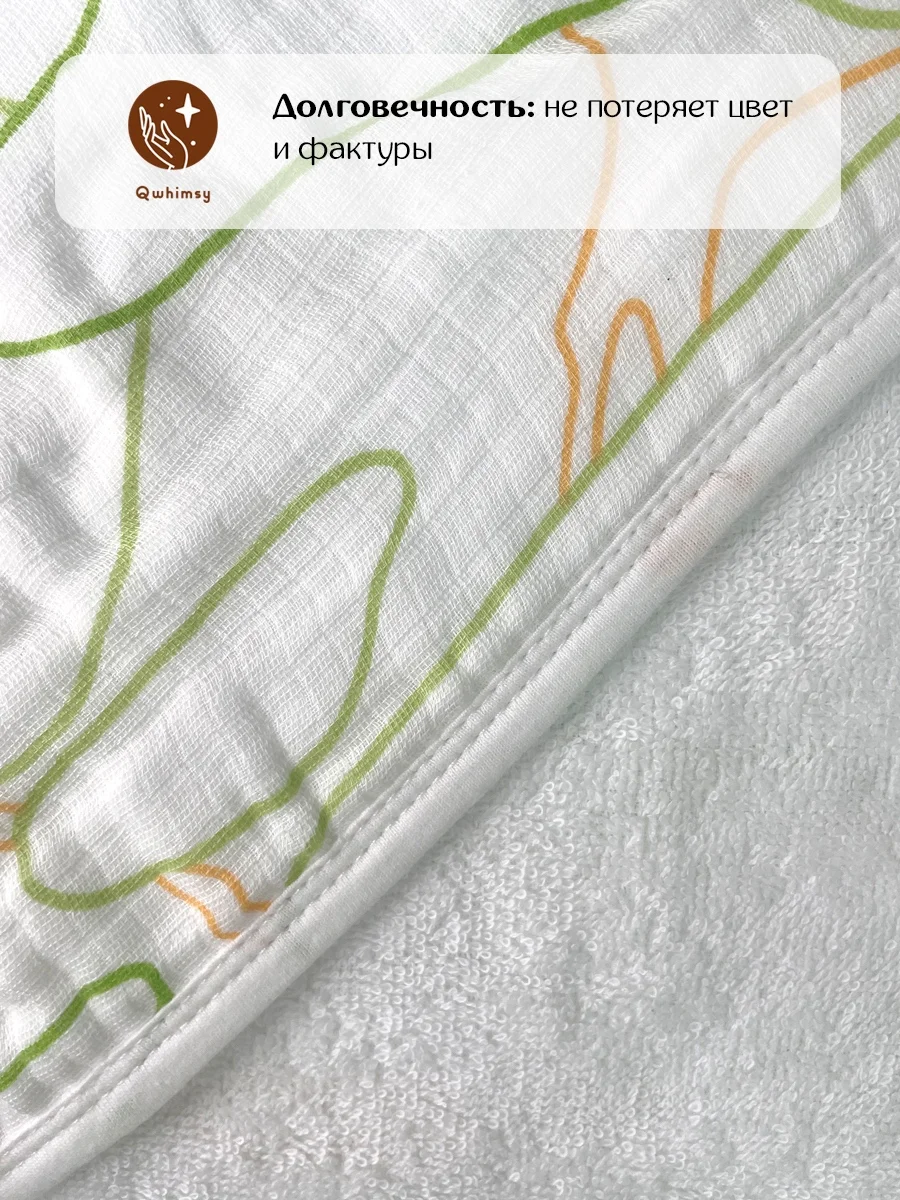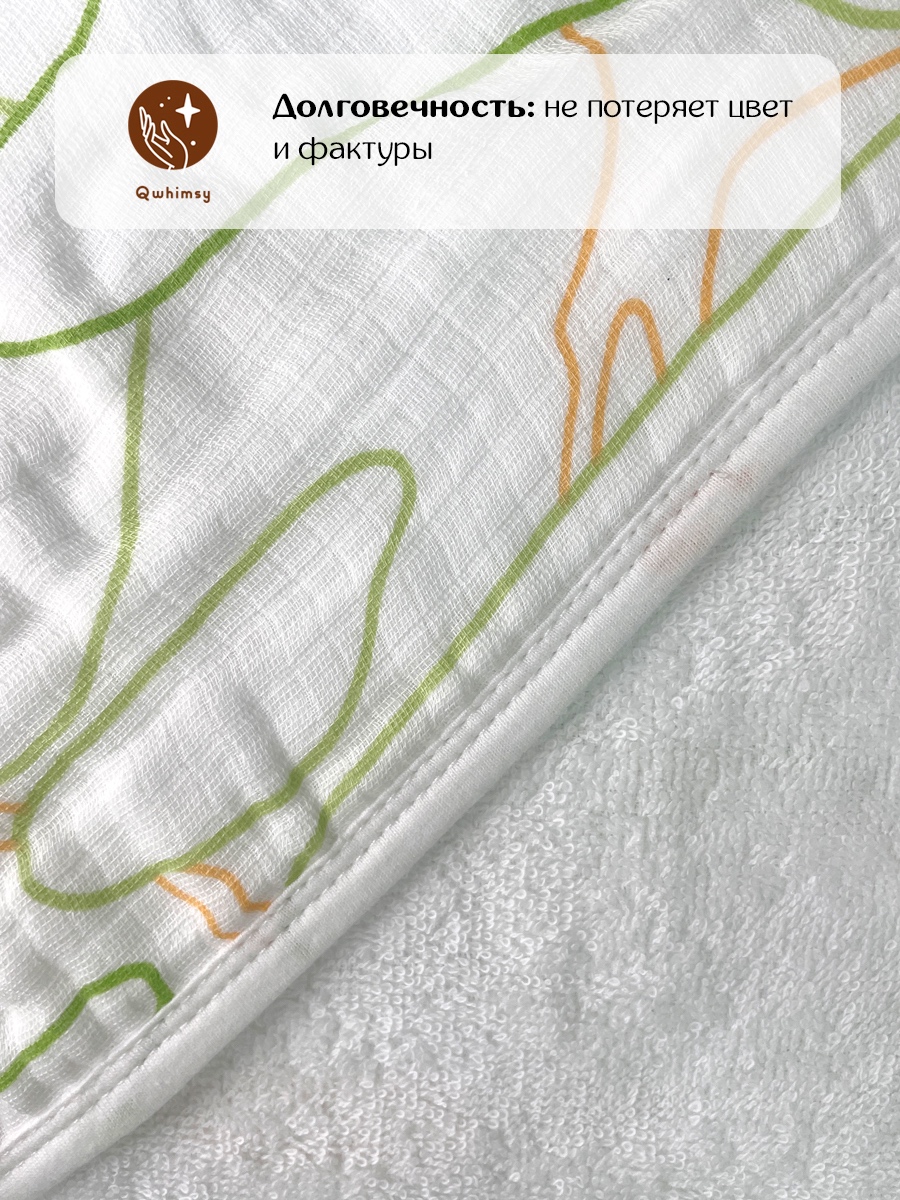 Качество. В полотенце для новорожденного Qwhimsy используется 100% хлопок, а ткань полотенца у внутренней стороны - махра, а у внешней, с рисунком, муслин. Это сочетание позволит сохранить здоровье вашего ребенка и сделать наше полотенце незаменимым помощником на каждый день. Полотенце отлично впитывает влагу и быстро сохнет.