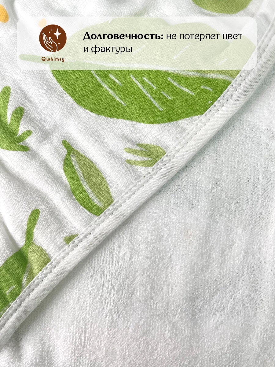 Качество. В полотенце для новорожденного Qwhimsy используется 100% хлопок, а ткань полотенца у внутренней стороны - махра, а у внешней, с рисунком, муслин. Это сочетание позволит сохранить здоровье вашего ребенка и сделать наше полотенце незаменимым помощником на каждый день. Полотенце отлично впитывает влагу и быстро сохнет.