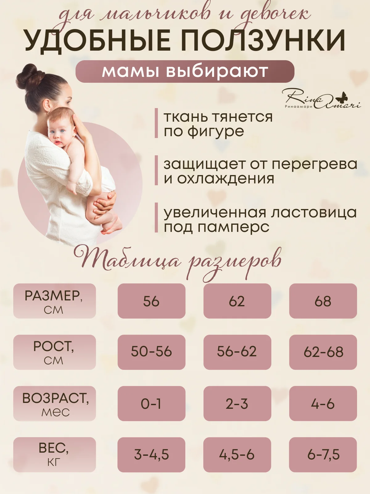 Ползунки — это штанишки с закрытой ножкой на манжетах и широким поясом, благодаря поясу нежно облегают животик и закрывают спинку, не раздражая кожу и не оставляя следов. При этом ползунки не спадают с ребёнка, легко надеваются и хорошо поддерживают памперс. Пояс позволяет легко регулировать высоту посадки. Штанишки выполнены из плотного и очень мягкого трикотажа. Ползунки подойдут для носки круглый год в жаркую погоду для прогулок на улице и дома, комбинируя с любой одеждой.