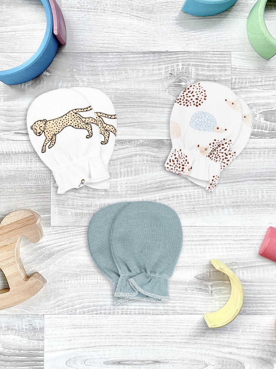 Рукавички-антицарапки Mjölk Ёжики на экрю/Baby Blue/Гепарды, сет из 3х пар