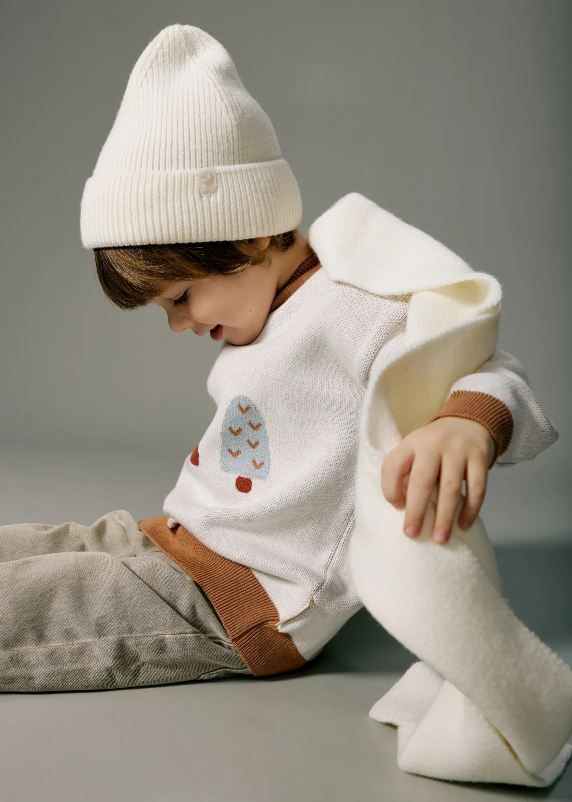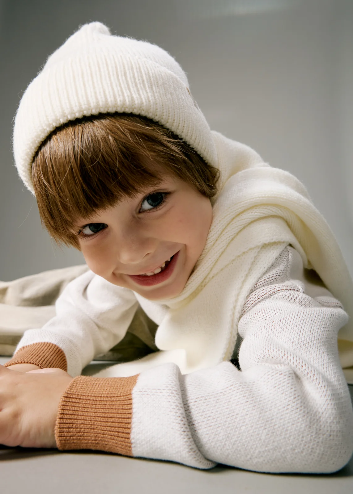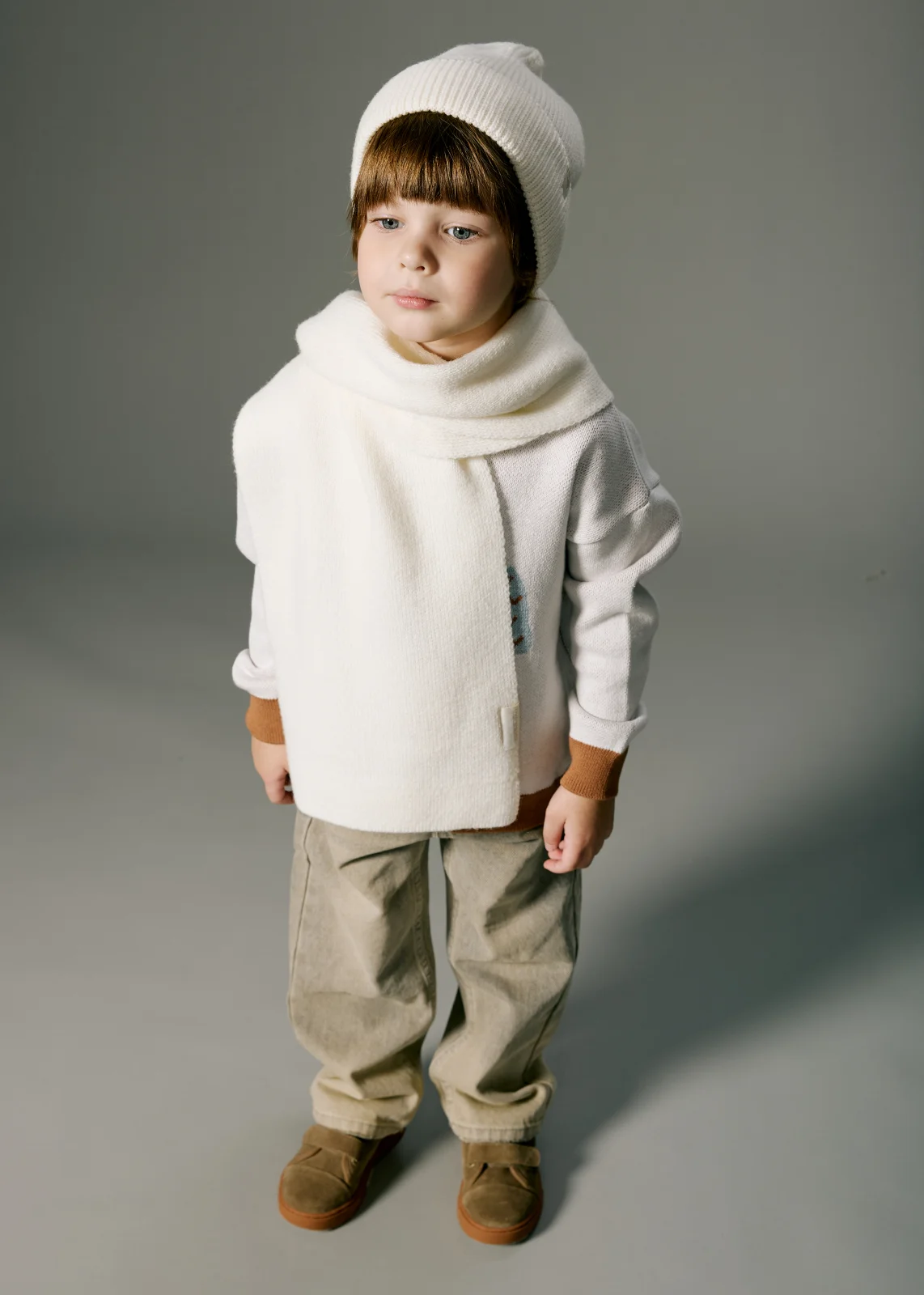 Вязаный шарф в однотонном варианте изготовлен из пряжи с шерстью мериноса. Отлично защитит шею малыша в межсезонье и в холодную погоду.