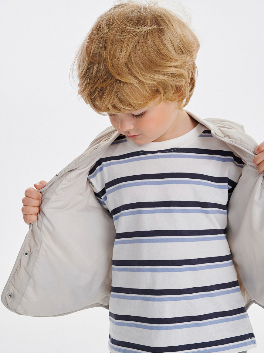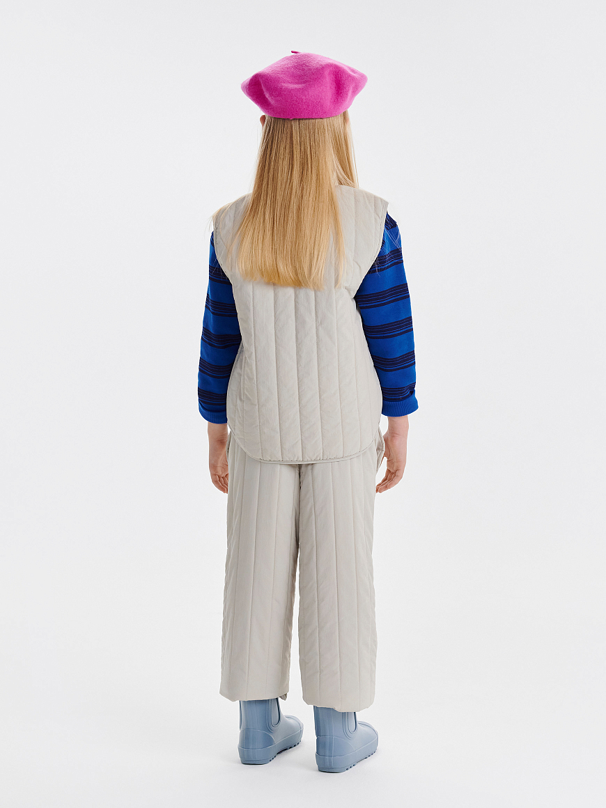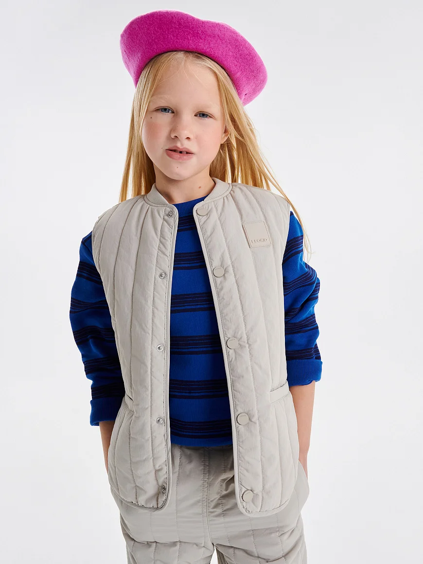 Жилет-ватник, как у самых модных взрослых. Можно носить самостоятельно или в качестве утепления, создавая уютные многослойные образы. Из него не захочется вырастать, поэтому мы выпустили его в широком размерном ряду — от 12 месяцев до 11 лет. Может похвастаться вертикальной стежкой, трендовым жатым эффектом, легким утеплителем 100 г, водоотталкивающей пропиткой, удлиненной спинкой, кармашками по бокам, мягким воротником бомберного типа и гладкой подкладкой, чтобы удобно было надевать. Создан для теплого межсезонья и прохладного лета, когда куртка уже не нужна, а уюта все-таки хочется.