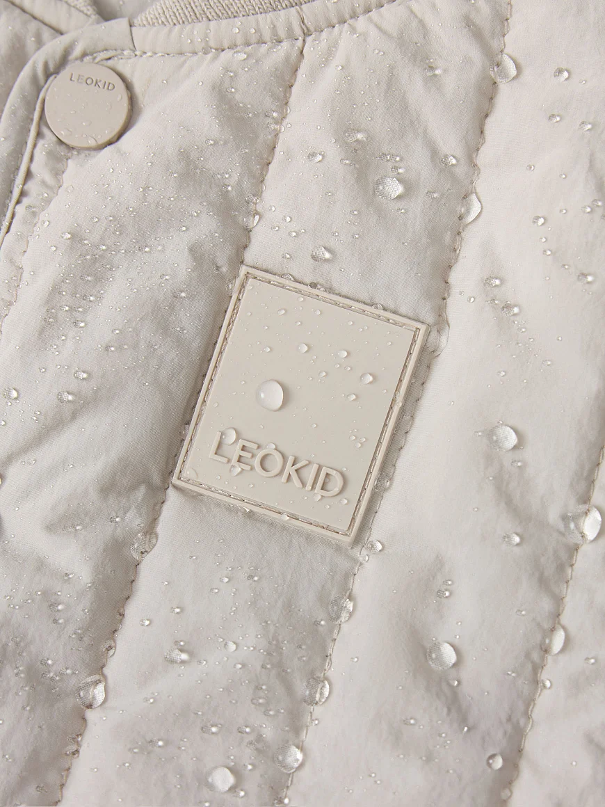 -ткань с жатым эффектом и вертикальной стежкой -застежка на кнопки по центру -воротник стойка из риба -передние карманы с листочками -окантовка из основной ткани -легкий листовой утеплитель 100 г/m2 -водоотталкивающая пропитка -брендированная фурнитура, нашивка-лого на груди