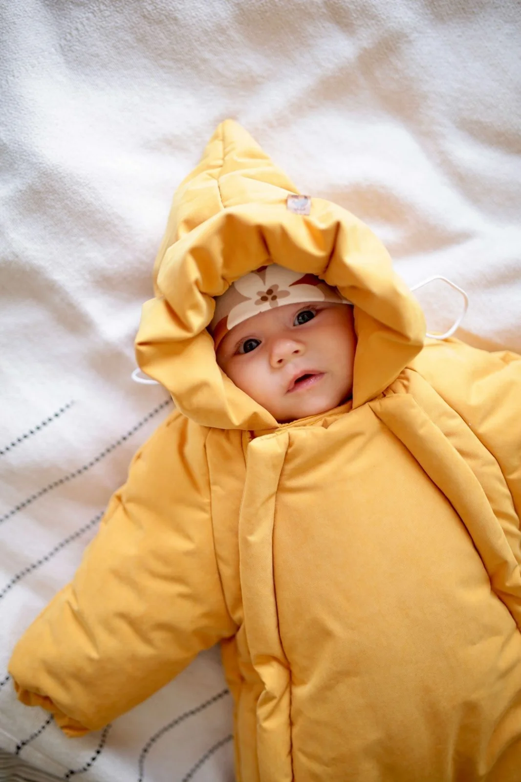Локаничный ,модный комбинезон. Непродуваемый, непромокаемый. Можно комбинировать с зимнем конвертом на прогулку. Манжеты можно подвернуть, как на ручках , так и на ножках. Утеплить ножки малыша , можно пинетками в цвет комбинезона. Температурный режим до -20/-25°C. 300 грамм наполнителя.